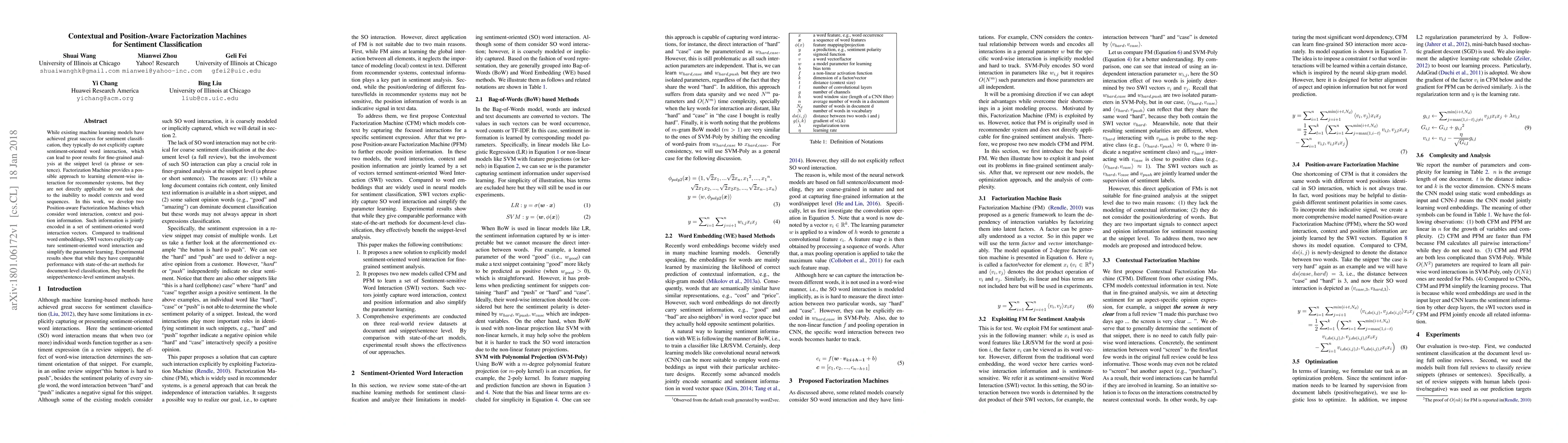 This paper introduces Position-aware Factorization Machines to enhance sentiment classification at the snippet level by explicitly capturing sentiment-oriented word interactions, context, and position information, leading to improved fine-grained analysis compared to traditional methods. Experimental results indicate the proposed model performs competitively at document level while significantly benefiting sentence-level sentiment analysis.