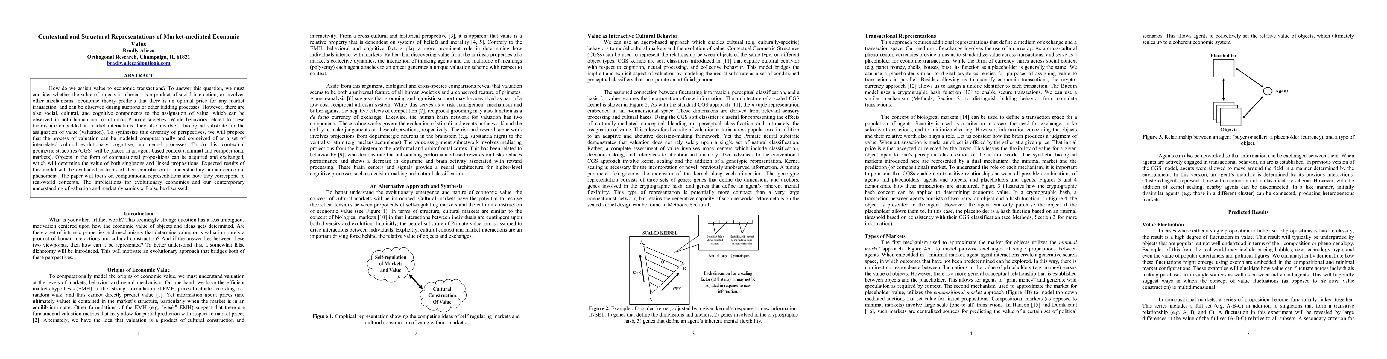 How do we assign value to economic transactions? To answer this question, we must consider whether the value of objects is inherent, is a product of social interaction, or involves other mechanisms. Economic theory predicts that there is an optimal price for any market transaction, and can be observed during auctions or other bidding processes. However, there are also social, cultural, and cognitive components to the assignation of value, which can be observed in both human and non-human Primate societies. While behaviors related to these factors are embedded in market interactions, they also involve a biological substrate for the assignation of value (valuation). To synthesize this diversity of perspectives, we will propose that the process of valuation can be modeled computationally and conceived of as a set of interrelated cultural evolutionary, cognitive, and neural processes. To do this, contextual geometric structures (CGS) will be placed in an agent-based context (minimal and compositional markets). Objects in the form of computational propositions can be acquired and exchanged, which will determine the value of both singletons and linked propositions. Expected results of this model will be evaluated in terms of their contribution to understanding human economic phenomena. The paper will focus on computational representations and how they correspond to real-world concepts. The implications for evolutionary economics and our contemporary understanding of valuation and market dynamics will also be discussed.