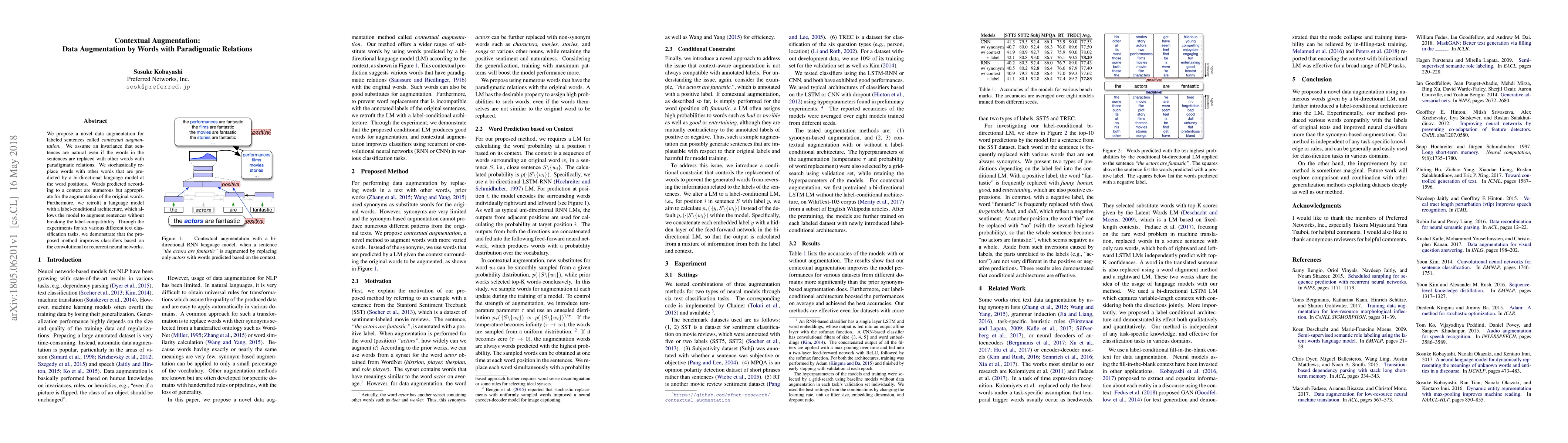 This paper introduces contextual augmentation, a method that enhances labeled sentence datasets by replacing words with contextually appropriate alternatives predicted by a bi-directional language model, improving classification performance across various text tasks. The technique retrofits the language model to maintain label-compatibility during augmentation.