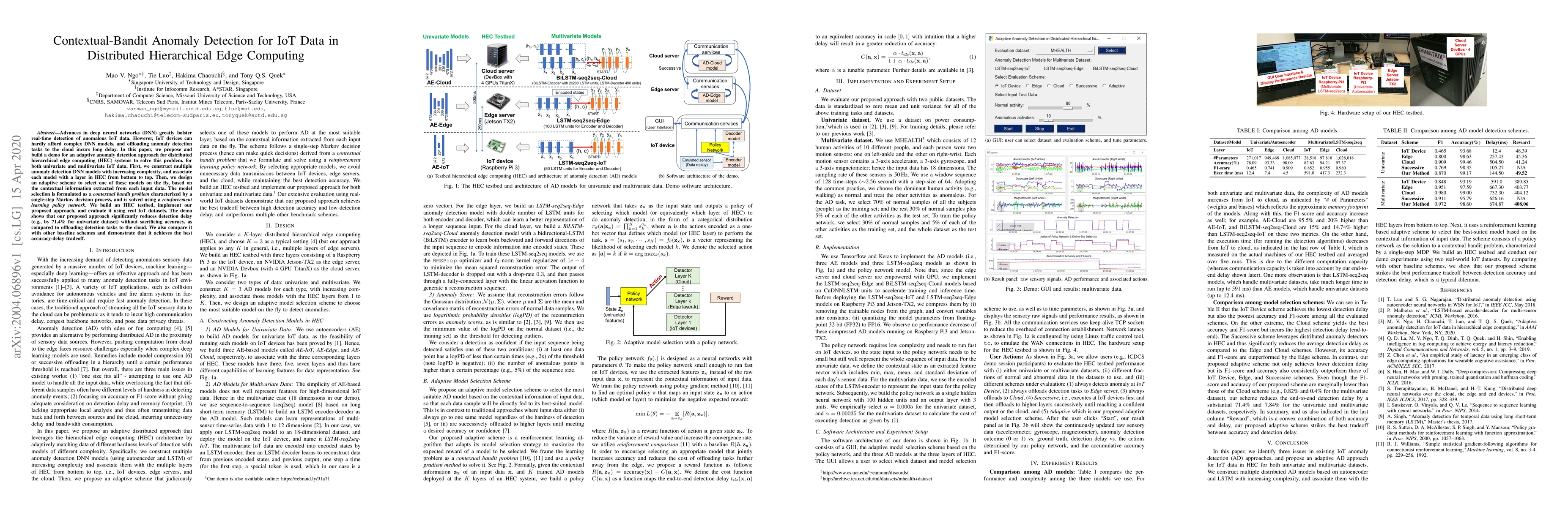 Advances in deep neural networks (DNN) greatly bolster real-time detection of anomalous IoT data. However, IoT devices can hardly afford complex DNN models, and offloading anomaly detection tasks to the cloud incurs long delay. In this paper, we propose and build a demo for an adaptive anomaly detection approach for distributed hierarchical edge computing (HEC) systems to solve this problem, for both univariate and multivariate IoT data. First, we construct multiple anomaly detection DNN models with increasing complexity, and associate each model with a layer in HEC from bottom to top. Then, we design an adaptive scheme to select one of these models on the fly, based on the contextual information extracted from each input data. The model selection is formulated as a contextual bandit problem characterized by a single-step Markov decision process, and is solved using a reinforcement learning policy network. We build an HEC testbed, implement our proposed approach, and evaluate it using real IoT datasets. The demo shows that our proposed approach significantly reduces detection delay (e.g., by 71.4% for univariate dataset) without sacrificing accuracy, as compared to offloading detection tasks to the cloud. We also compare it with other baseline schemes and demonstrate that it achieves the best accuracy-delay tradeoff. Our demo is also available online: https://rebrand.ly/91a71