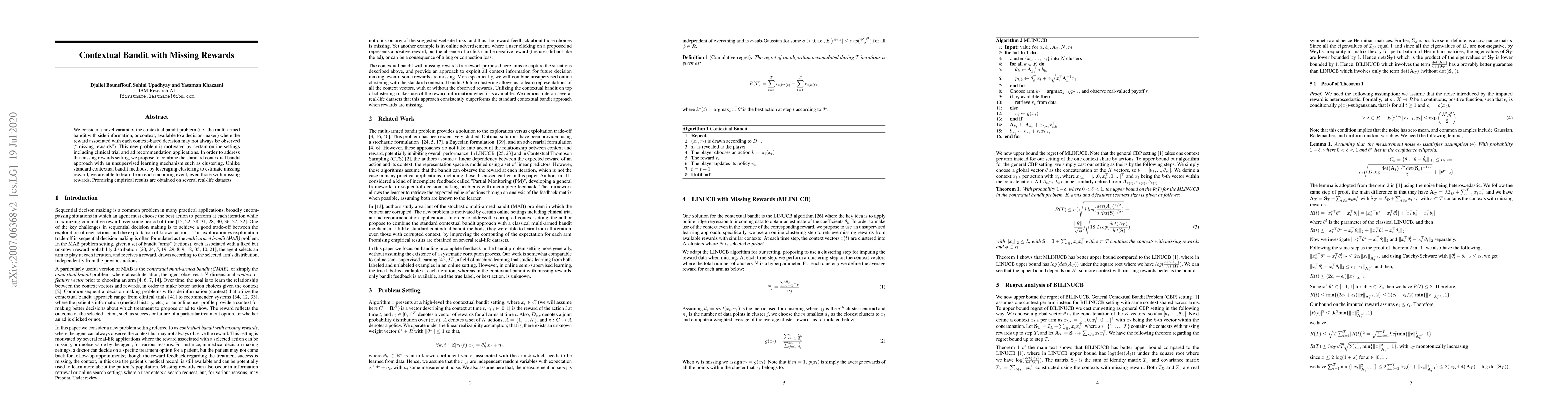 This paper introduces a contextual bandit problem variant where rewards may be missing, proposing a method combining contextual bandit techniques with unsupervised learning to estimate missing rewards. Empirical results show promising performance on real-life datasets.