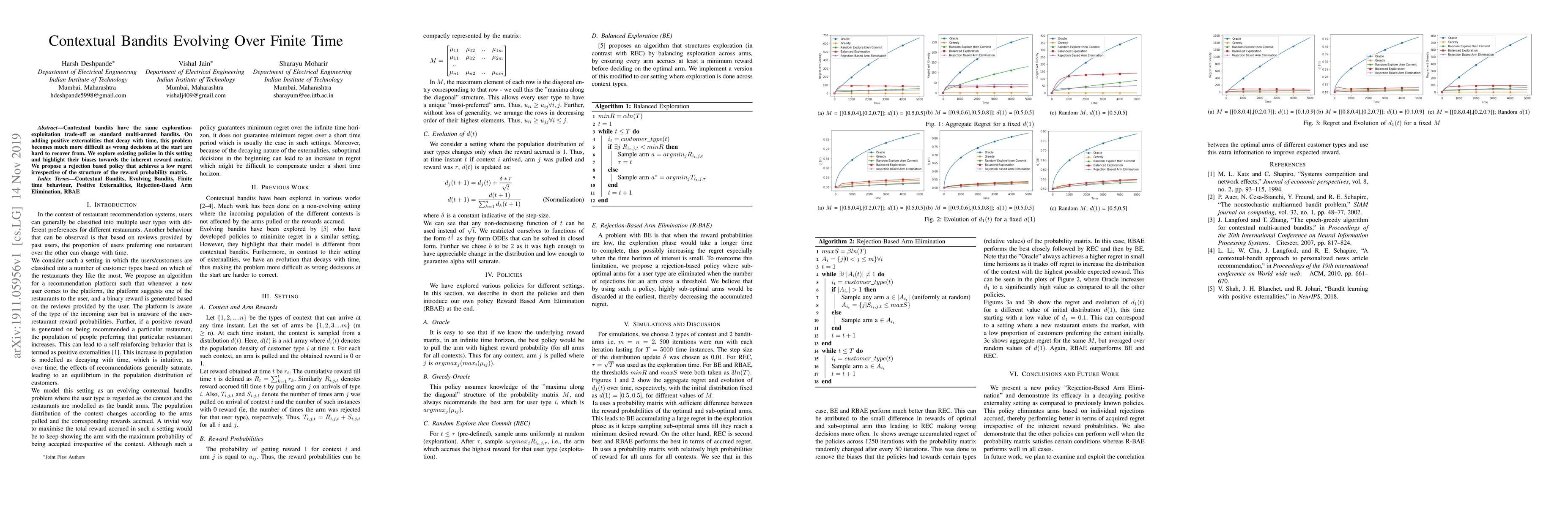 Contextual bandits have the same exploration-exploitation trade-off as standard multi-armed bandits. On adding positive externalities that decay with time, this problem becomes much more difficult as wrong decisions at the start are hard to recover from. We explore existing policies in this setting and highlight their biases towards the inherent reward matrix. We propose a rejection based policy that achieves a low regret irrespective of the structure of the reward probability matrix.