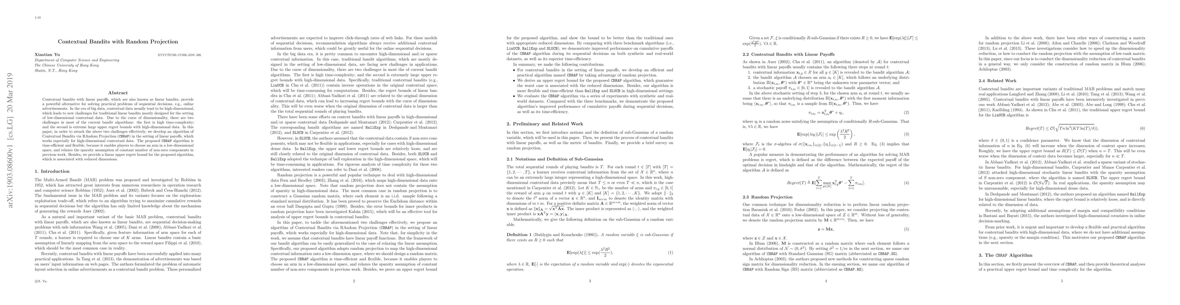 This paper introduces a novel algorithm called \texttt{CBRAP} for contextual bandits with linear payoffs, addressing high-dimensional data challenges by using random projection to reduce dimensionality and achieve time efficiency, while providing a linear upper regret bound.
