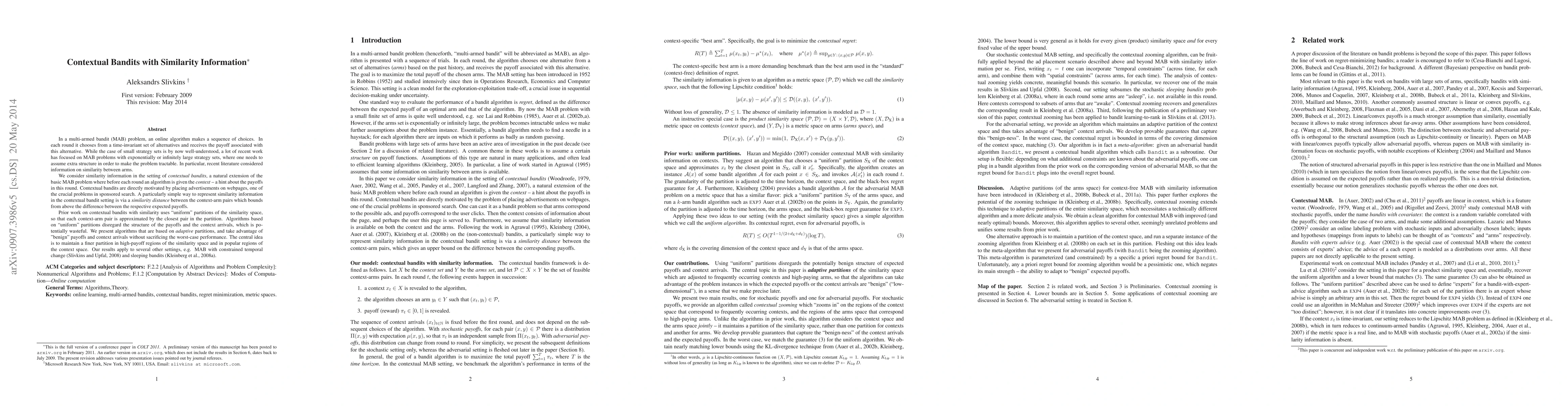 This paper proposes efficient algorithms for contextual bandits that leverage similarity information between arms, addressing the inefficiencies of prior uniform partition methods. The new adaptive partitioning approach dynamically adjusts to frequently occurring contexts and high-payoff arms, enhancing performance.