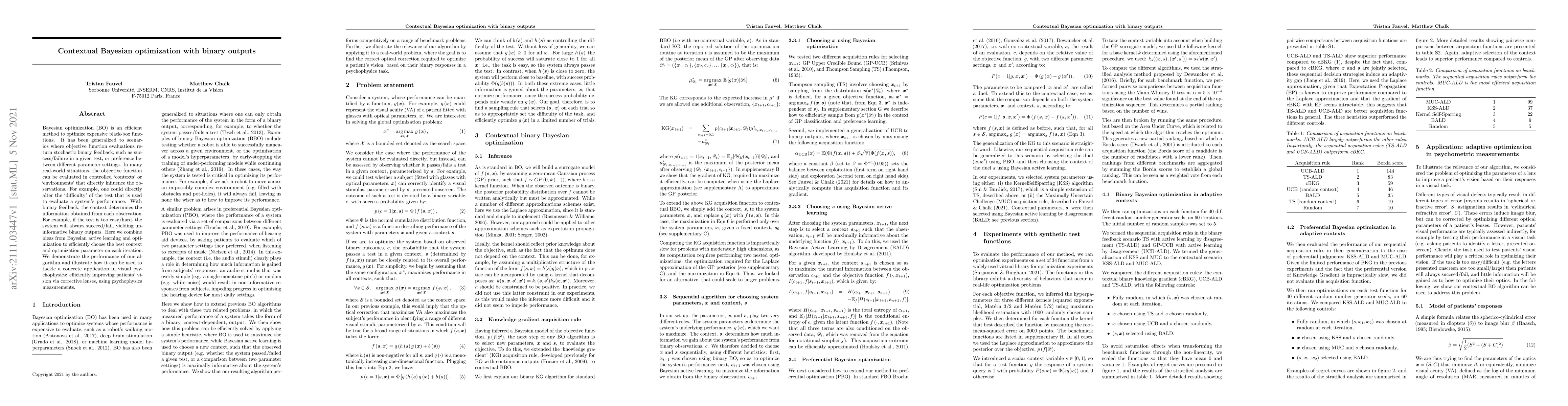 This paper proposes a contextual Bayesian optimization method for optimizing expensive black-box functions with binary outputs, integrating context-aware evaluations to improve efficiency. The approach is demonstrated through an application in visual psychophysics to enhance patients' vision using corrective lenses.