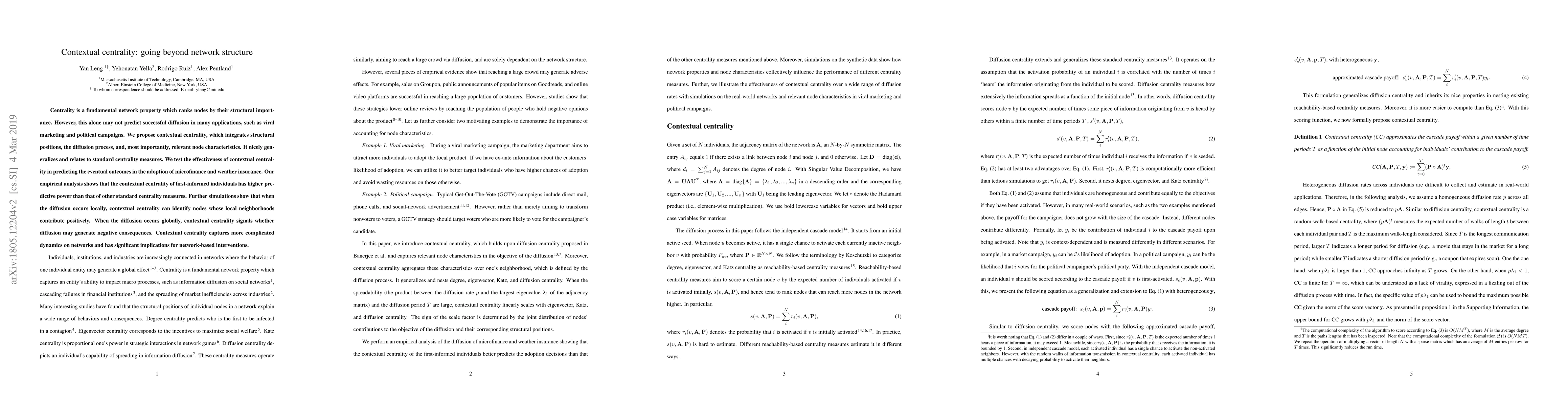 Centrality is a fundamental network property which ranks nodes by their structural importance. However, structural importance may not suffice to predict successful diffusions in a wide range of applications, such as word-of-mouth marketing and political campaigns. In particular, nodes with high structural importance may contribute negatively to the objective of the diffusion. To address this problem, we propose contextual centrality, which integrates structural positions, the diffusion process, and, most importantly, nodal contributions to the objective of the diffusion. We perform an empirical analysis of the adoption of microfinance in Indian villages and weather insurance in Chinese villages. Results show that contextual centrality of the first-informed individuals has higher predictive power towards the eventual adoption outcomes than other standard centrality measures. Interestingly, when the product of diffusion rate $p$ and the largest eigenvalue $\lambda_1$ is larger than one and diffusion period is long, contextual centrality linearly scales with eigenvector centrality. This approximation reveals that contextual centrality identifies scenarios where a higher diffusion rate of individuals may negatively influence the cascade payoff. Further simulations on the synthetic and real-world networks show that contextual centrality has the advantage of selecting an individual whose local neighborhood generates a high cascade payoff when $p \lambda_1 < 1$. Under this condition, stronger homophily leads to higher cascade payoff. Our results suggest that contextual centrality captures more complicated dynamics on networks and has significant implications for applications, such as information diffusion, viral marketing, and political campaigns.