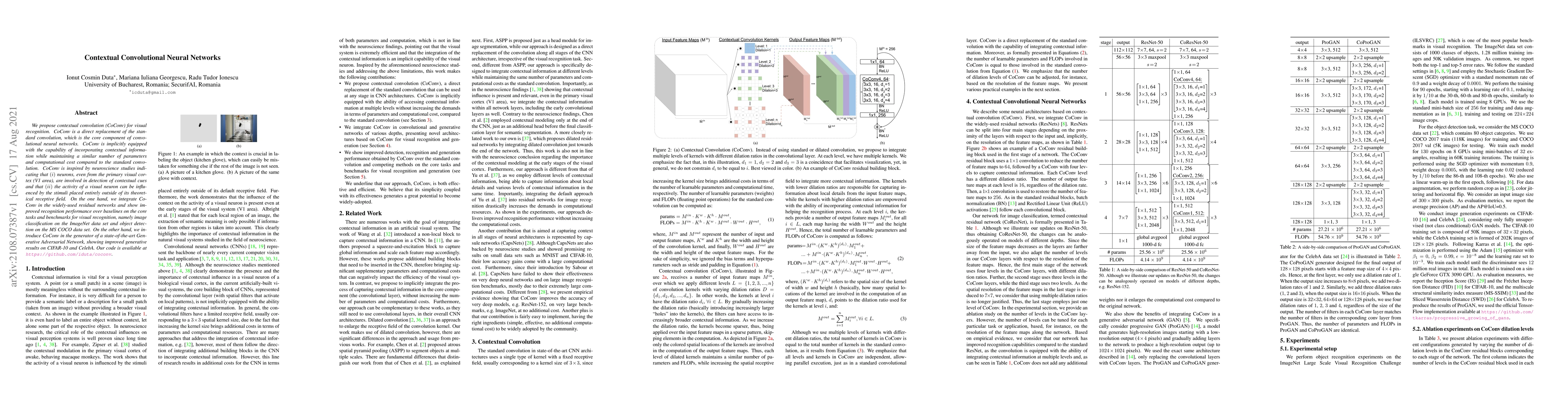 This paper proposes contextual convolution (CoConv) as a replacement for standard convolution in CNNs, aiming to incorporate contextual information without increasing computational cost. CoConv shows improved performance in image classification on ImageNet and object detection on MS COCO, as well as enhanced generative results in GANs on CIFAR-10 and CelebA.