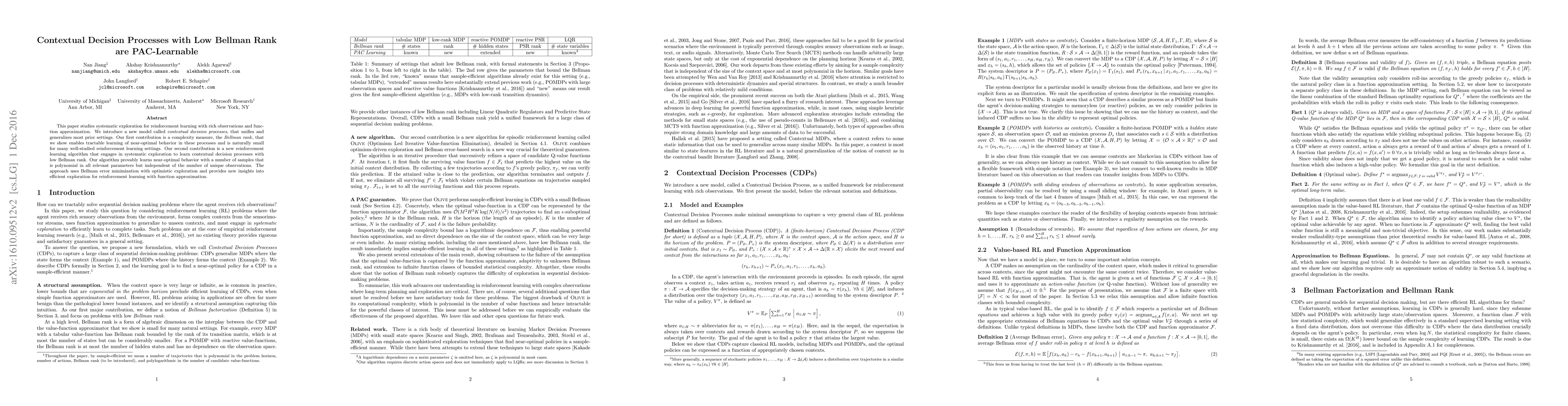 This paper introduces contextual decision processes to generalize reinforcement learning settings and proposes a complexity measure called Bellman rank, which facilitates efficient learning. It presents a new algorithm that systematically explores to learn near-optimal behavior with polynomial sample complexity, independent of the number of unique observations.