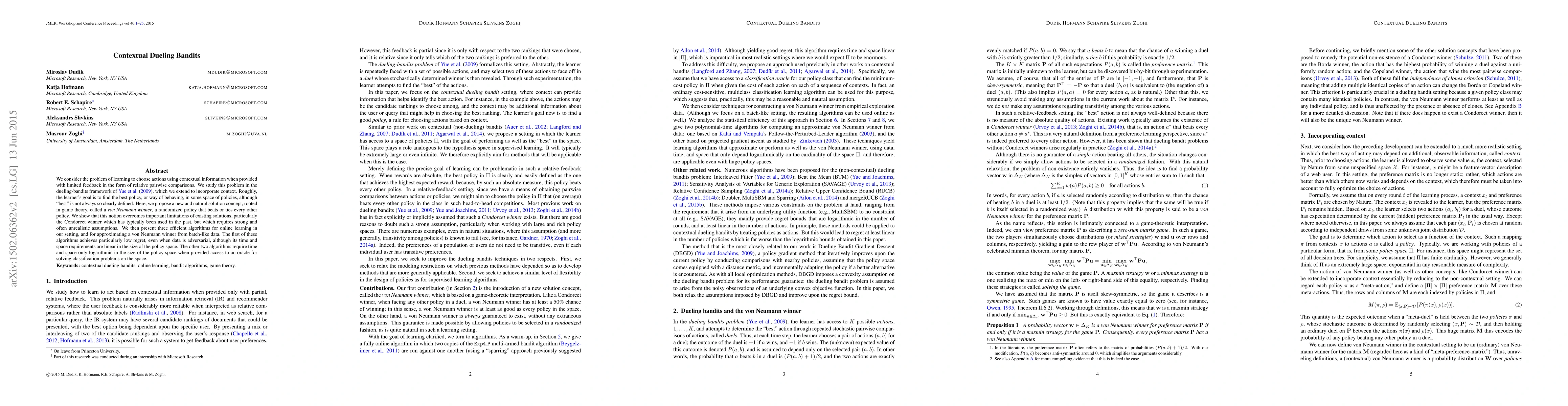 We consider the problem of learning to choose actions using contextual information when provided with limited feedback in the form of relative pairwise comparisons. We study this problem in the dueling-bandits framework of Yue et al. (2009), which we extend to incorporate context. Roughly, the learner's goal is to find the best policy, or way of behaving, in some space of policies, although "best" is not always so clearly defined. Here, we propose a new and natural solution concept, rooted in game theory, called a von Neumann winner, a randomized policy that beats or ties every other policy. We show that this notion overcomes important limitations of existing solutions, particularly the Condorcet winner which has typically been used in the past, but which requires strong and often unrealistic assumptions. We then present three efficient algorithms for online learning in our setting, and for approximating a von Neumann winner from batch-like data. The first of these algorithms achieves particularly low regret, even when data is adversarial, although its time and space requirements are linear in the size of the policy space. The other two algorithms require time and space only logarithmic in the size of the policy space when provided access to an oracle for solving classification problems on the space.