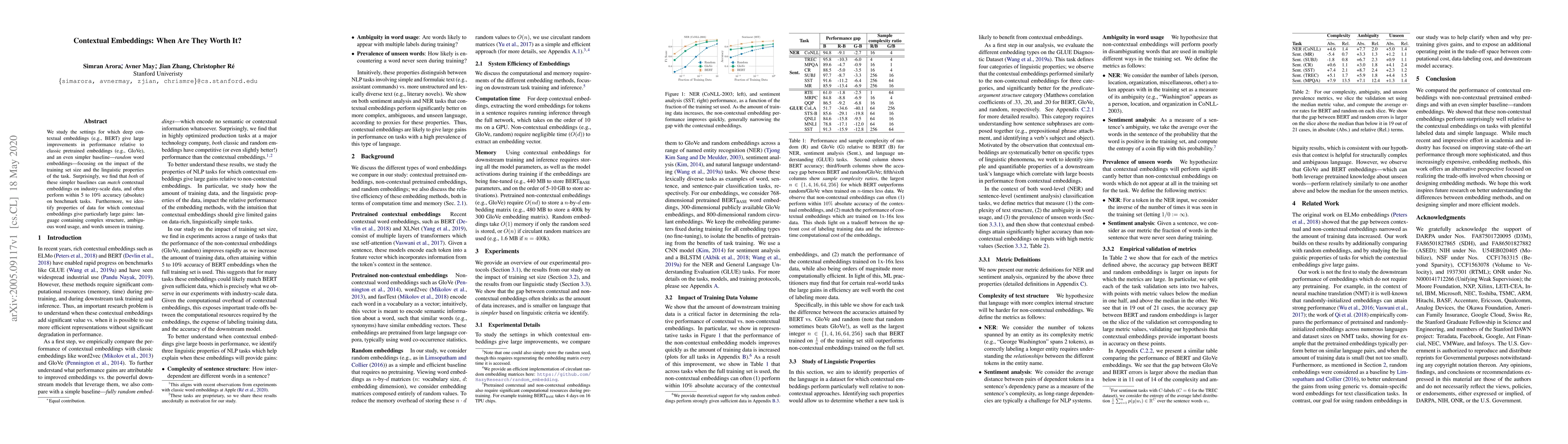 We study the settings for which deep contextual embeddings (e.g., BERT) give large improvements in performance relative to classic pretrained embeddings (e.g., GloVe), and an even simpler baseline---random word embeddings---focusing on the impact of the training set size and the linguistic properties of the task. Surprisingly, we find that both of these simpler baselines can match contextual embeddings on industry-scale data, and often perform within 5 to 10% accuracy (absolute) on benchmark tasks. Furthermore, we identify properties of data for which contextual embeddings give particularly large gains: language containing complex structure, ambiguous word usage, and words unseen in training.