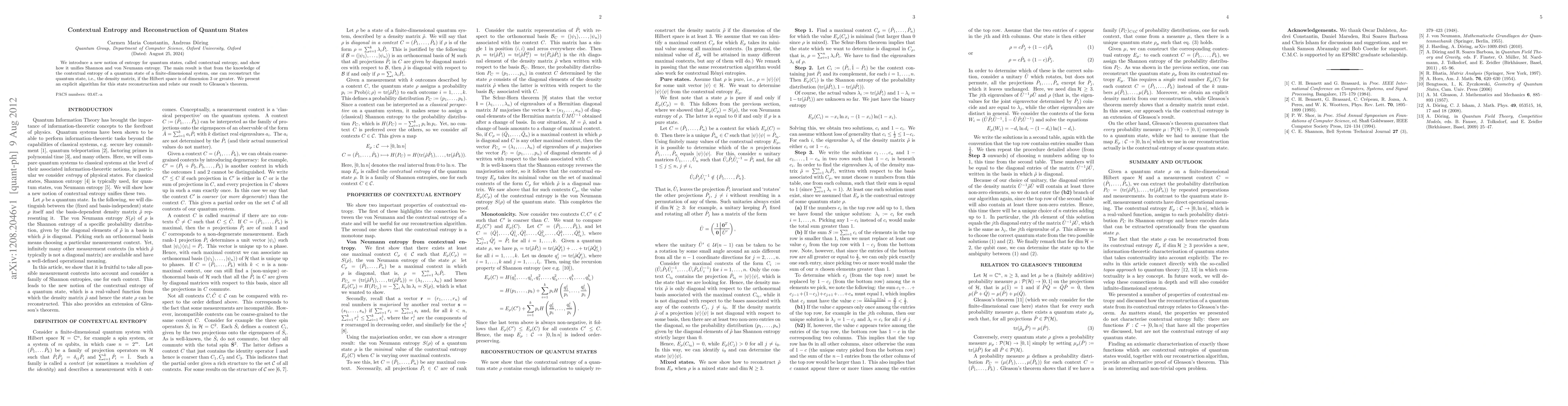 This paper introduces contextual entropy, a new measure unifying Shannon and von Neumann entropy, and demonstrates its use in reconstructing quantum states of finite-dimensional systems with dimensions of 3 or greater. An explicit algorithm for state reconstruction is provided, linking the findings to Gleason's theorem.