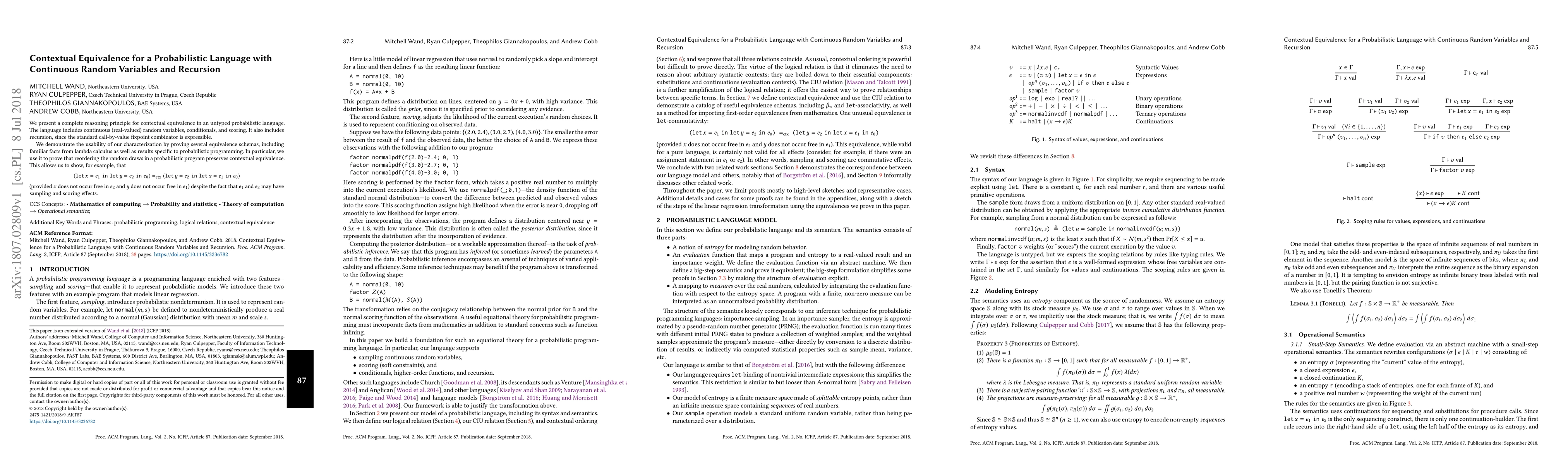 We present a complete reasoning principle for contextual equivalence in an untyped probabilistic language. The language includes continuous (real-valued) random variables, conditionals, and scoring. It also includes recursion, since the standard call-by-value fixpoint combinator is expressible. We demonstrate the usability of our characterization by proving several equivalence schemas, including familiar facts from lambda calculus as well as results specific to probabilistic programming. In particular, we use it to prove that reordering the random draws in a probabilistic program preserves contextual equivalence. This allows us to show, for example, that (let x = $e_1$ in let y = $e_2$ in $e_0$) is equivalent to (let y = $e_2$ in let x = $e_1$ in $e_0$) (provided $x$ does not occur free in $e_2$ and $y$ does not occur free in $e_1$) despite the fact that $e_1$ and $e_2$ may have sampling and scoring effects.