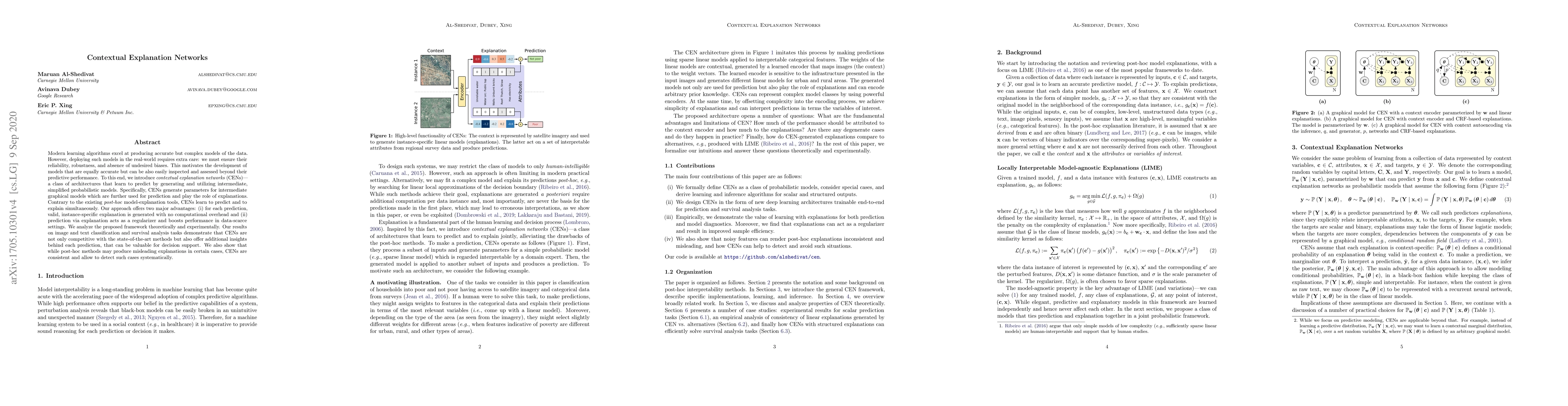 The research introduces Contextual Explanation Networks (CENs), a class of models that learn to predict by generating and utilizing intermediate, simplified probabilistic models as explanations. CENs simultaneously predict and explain, offering advantages such as instance-specific explanations with no computational overhead and prediction via explanation acting as a regularizer, especially in data-scarce settings.