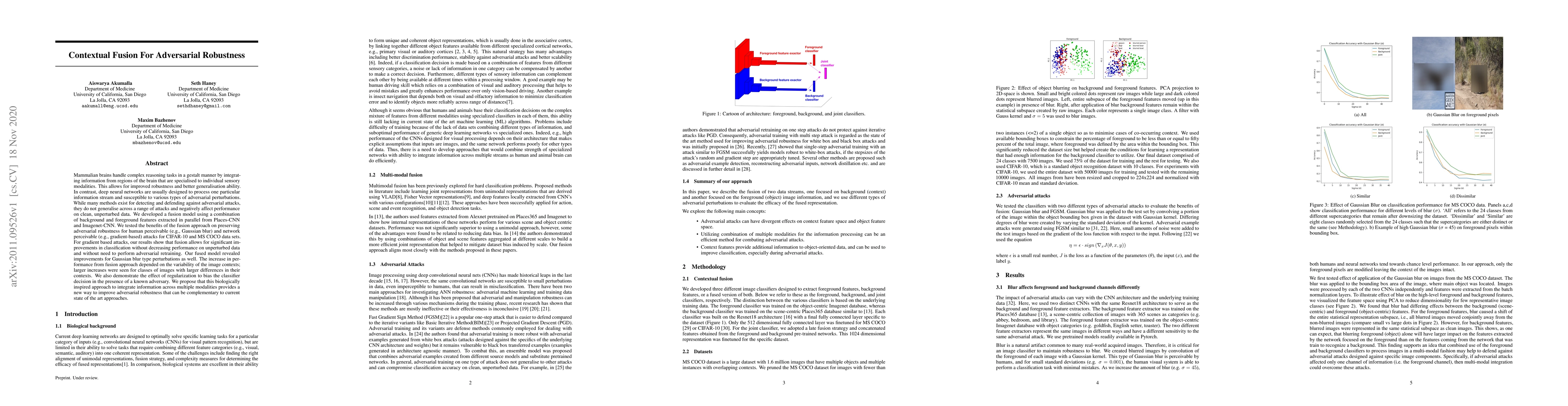 This paper proposes a contextual fusion model that integrates background and foreground features from specialized CNNs to improve adversarial robustness in deep neural networks. The fusion approach enhances performance against various adversarial attacks without degrading performance on clean data, suggesting a new biologically inspired method for improving network resilience.