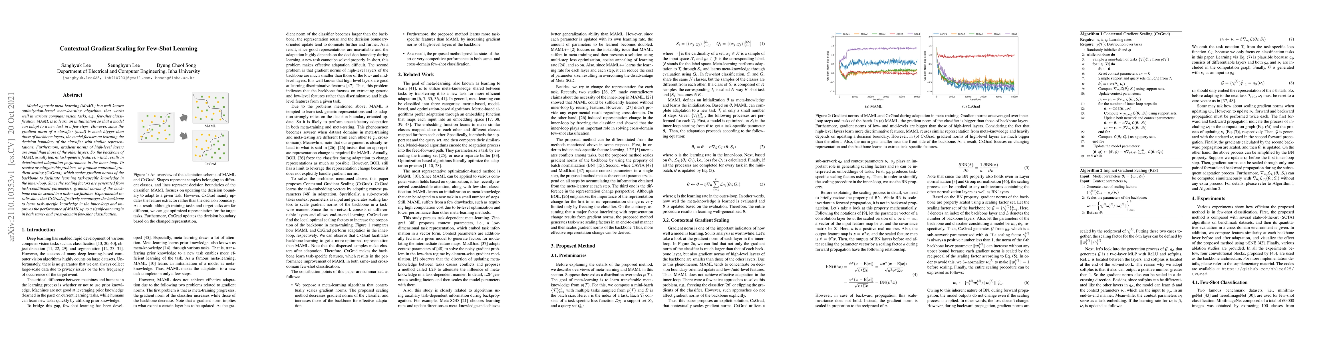 Model-agnostic meta-learning (MAML) is a well-known optimization-based meta-learning algorithm that works well in various computer vision tasks, e.g., few-shot classification. MAML is to learn an initialization so that a model can adapt to a new task in a few steps. However, since the gradient norm of a classifier (head) is much bigger than those of backbone layers, the model focuses on learning the decision boundary of the classifier with similar representations. Furthermore, gradient norms of high-level layers are small than those of the other layers. So, the backbone of MAML usually learns task-generic features, which results in deteriorated adaptation performance in the inner-loop. To resolve or mitigate this problem, we propose contextual gradient scaling (CxGrad), which scales gradient norms of the backbone to facilitate learning task-specific knowledge in the inner-loop. Since the scaling factors are generated from task-conditioned parameters, gradient norms of the backbone can be scaled in a task-wise fashion. Experimental results show that CxGrad effectively encourages the backbone to learn task-specific knowledge in the inner-loop and improves the performance of MAML up to a significant margin in both same- and cross-domain few-shot classification.