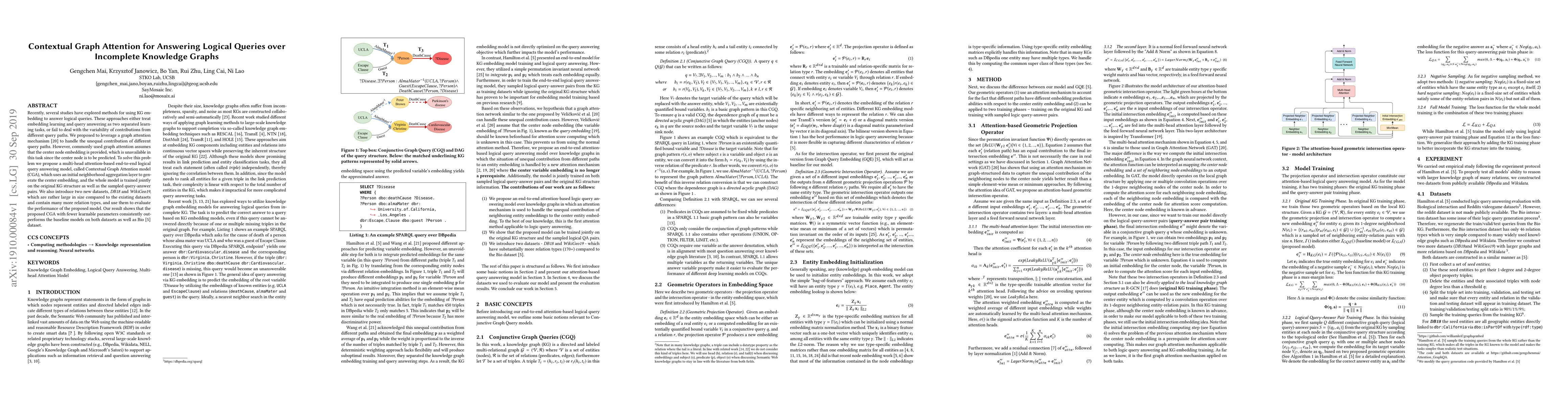 Recently, several studies have explored methods for using KG embedding to answer logical queries. These approaches either treat embedding learning and query answering as two separated learning tasks, or fail to deal with the variability of contributions from different query paths. We proposed to leverage a graph attention mechanism to handle the unequal contribution of different query paths. However, commonly used graph attention assumes that the center node embedding is provided, which is unavailable in this task since the center node is to be predicted. To solve this problem we propose a multi-head attention-based end-to-end logical query answering model, called Contextual Graph Attention model(CGA), which uses an initial neighborhood aggregation layer to generate the center embedding, and the whole model is trained jointly on the original KG structure as well as the sampled query-answer pairs. We also introduce two new datasets, DB18 and WikiGeo19, which are rather large in size compared to the existing datasets and contain many more relation types, and use them to evaluate the performance of the proposed model. Our result shows that the proposed CGA with fewer learnable parameters consistently outperforms the baseline models on both datasets as well as Bio dataset.