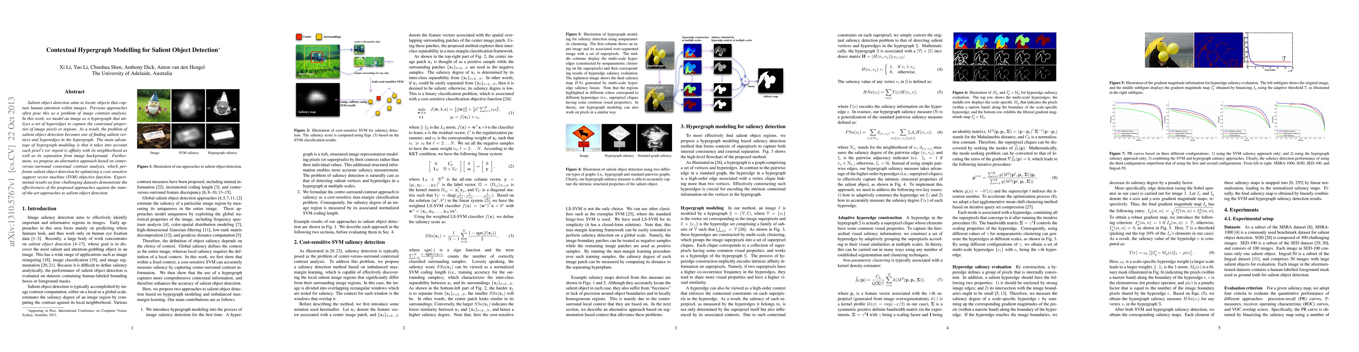 This paper proposes a contextual hypergraph modeling approach for salient object detection, emphasizing the importance of pixel or region affinity with neighborhoods and separation from the background. An alternative method based on center-versus-surround contextual contrast analysis using a cost-sensitive SVM optimizes detection performance, outperforming state-of-the-art methods on multiple datasets.