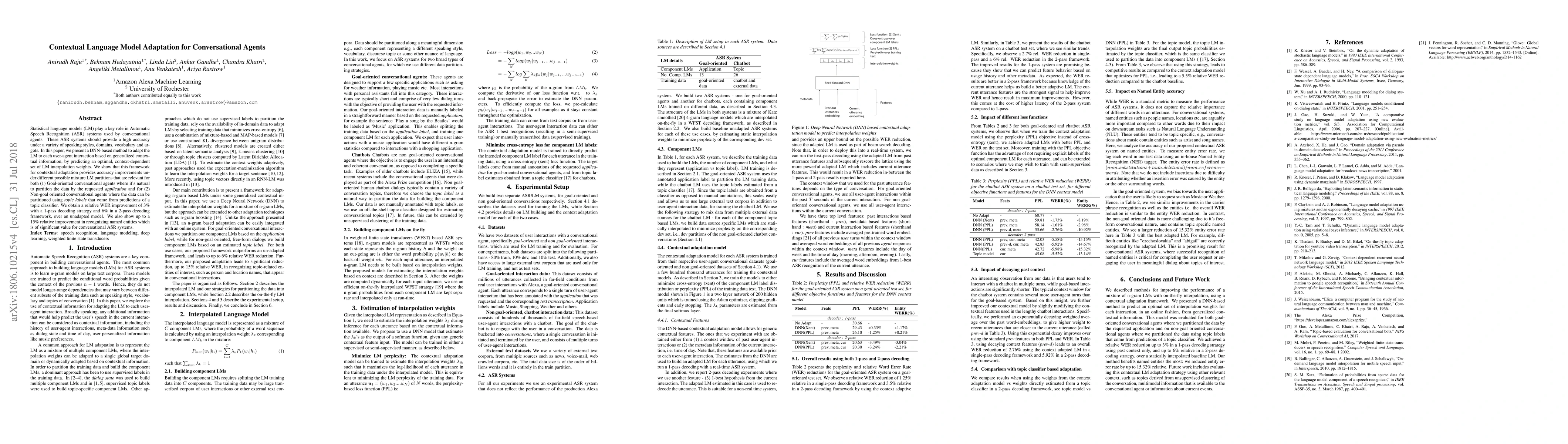 This paper proposes a DNN-based method for adapting language models in conversational agents to improve accuracy across diverse speaking styles and domains. The approach achieves a 3% relative Word Error Rate (WER) improvement in a 1-pass decoding and up to 6% in a 2-pass framework, along with a 15% improvement in named entity recognition.