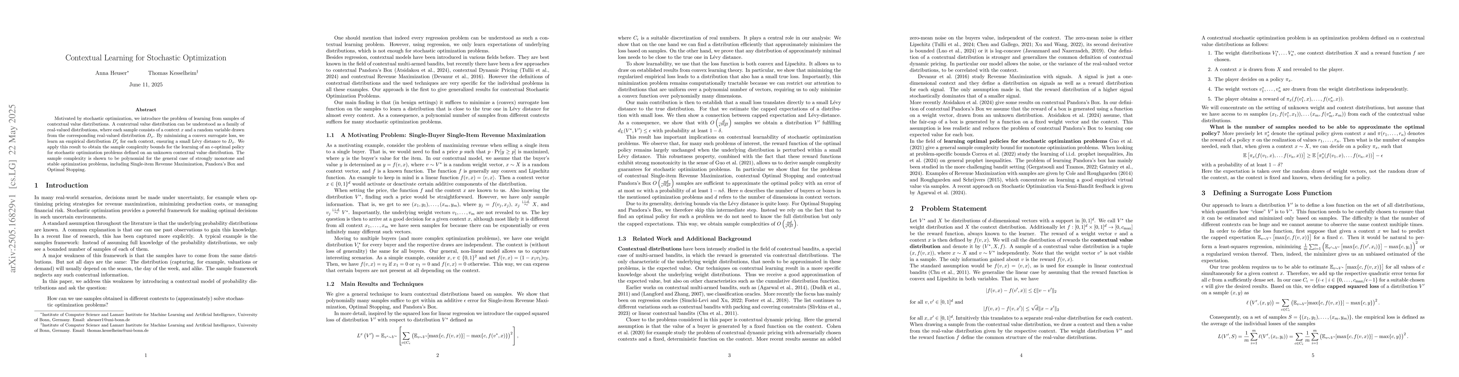 The paper introduces a method for learning from samples of contextual value distributions, minimizing a convex surrogate loss to ensure a small L'evy distance to the original distribution D_x, and applies this to stochastic optimization problems.