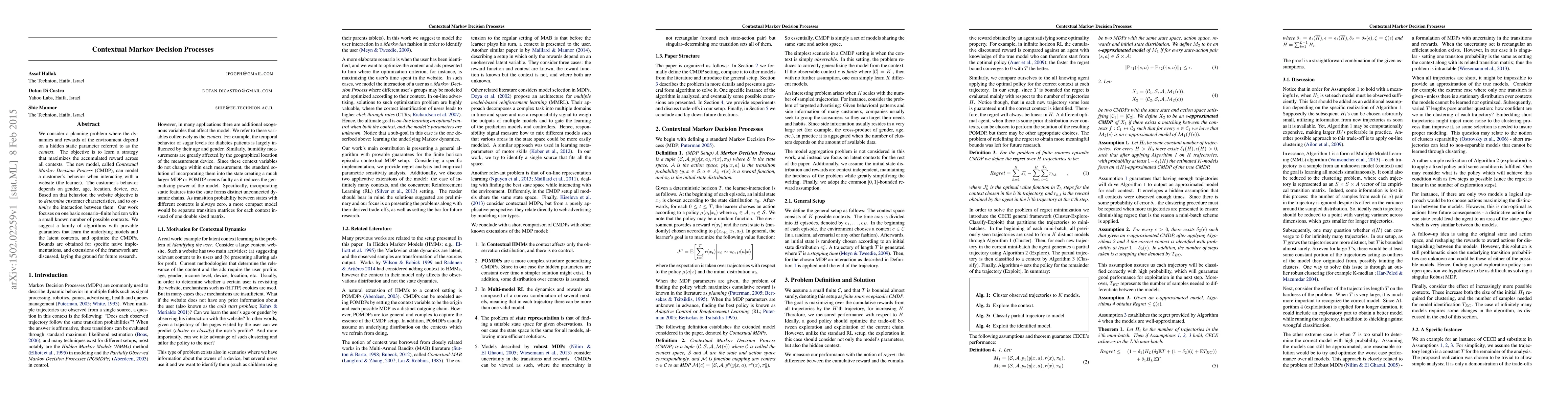 We consider a planning problem where the dynamics and rewards of the environment depend on a hidden static parameter referred to as the context. The objective is to learn a strategy that maximizes the accumulated reward across all contexts. The new model, called Contextual Markov Decision Process (CMDP), can model a customer's behavior when interacting with a website (the learner). The customer's behavior depends on gender, age, location, device, etc. Based on that behavior, the website objective is to determine customer characteristics, and to optimize the interaction between them. Our work focuses on one basic scenario--finite horizon with a small known number of possible contexts. We suggest a family of algorithms with provable guarantees that learn the underlying models and the latent contexts, and optimize the CMDPs. Bounds are obtained for specific naive implementations, and extensions of the framework are discussed, laying the ground for future research.