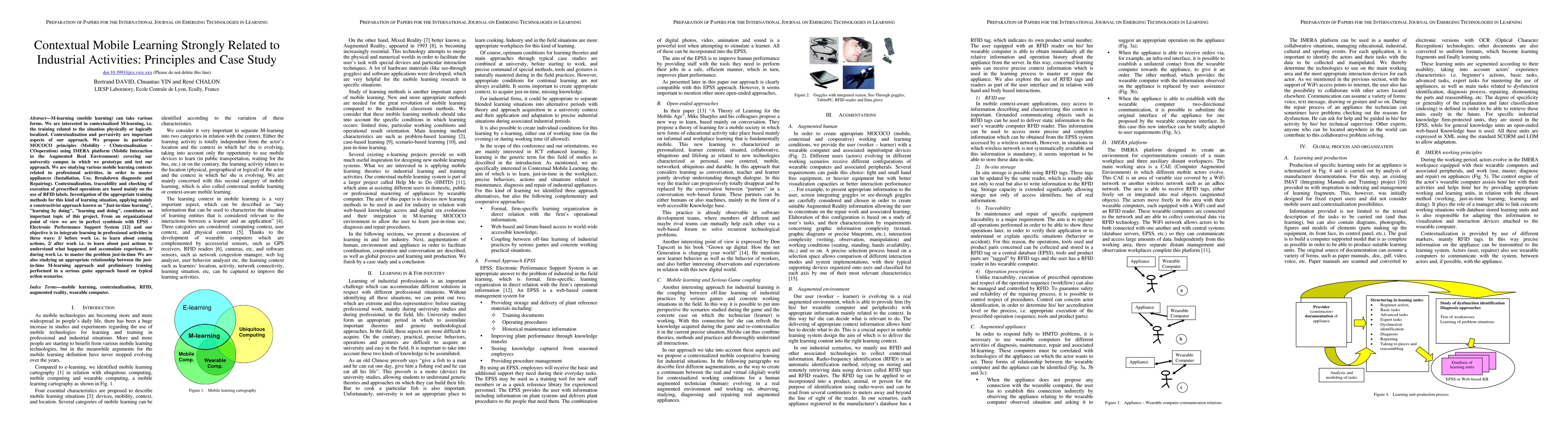 M-learning (mobile learning) can take various forms. We are interested in contextualized M-learning, i.e. the training related to the situation physically or logically localized. Contextualization and pervasivity are important aspects of our approach. We propose in particular MOCOCO principles (Mobility - COntextualisation - COoperation) using IMERA platform (Mobile Interaction in the Augmented Real Environment). We are studying various mobile learning contexts related to professional activities, in order to master appliances (Installation, Use, Breakdown diagnostic and Repairing). Contextualization, traceability and checking of execution of prescribed operations are based mainly on the use of RFID labels. Investigation of the appropriate training methods for this kind of learning situation, applying mainly a constructivist approach known as "Just-in-time learning", "learning by doing", "learning and doing", constitutes an important topic of this project. From an organizational point of view we are in perfect symbiosis with EPSS - Electronic Performance Support System [12] and our objective is to integrate learning in professional activities in three ways: 1/ before work i.e. to learn about coming actions, 2/ after work i.e. to learn about past actions to understand what happened and accumulate experience, 3/ during work i.e. to master the problem just-in-time