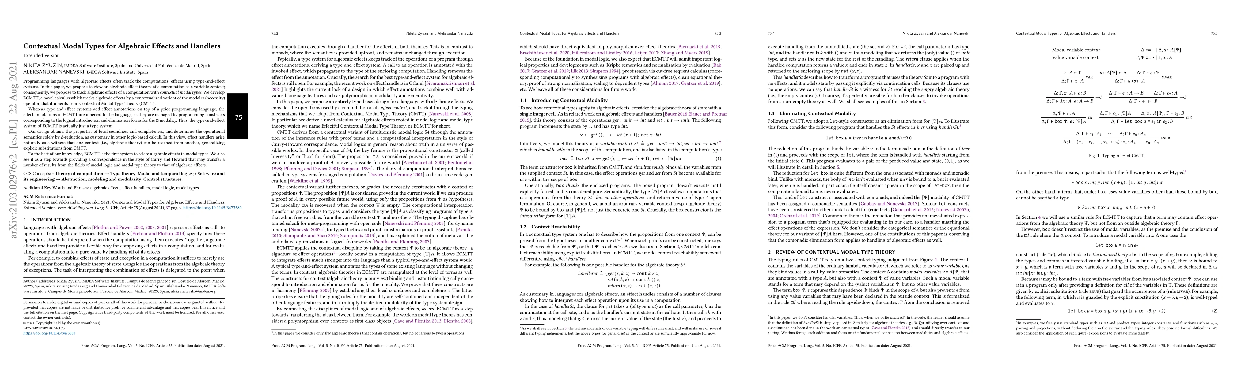 This paper introduces ECMTT, a novel calculus that uses contextual modal types to track algebraic effects inherent in the language rather than through external annotations. ECMTT integrates effect management via logical forms for necessity, achieving local soundness and completeness, and operational semantics through β-reduction.