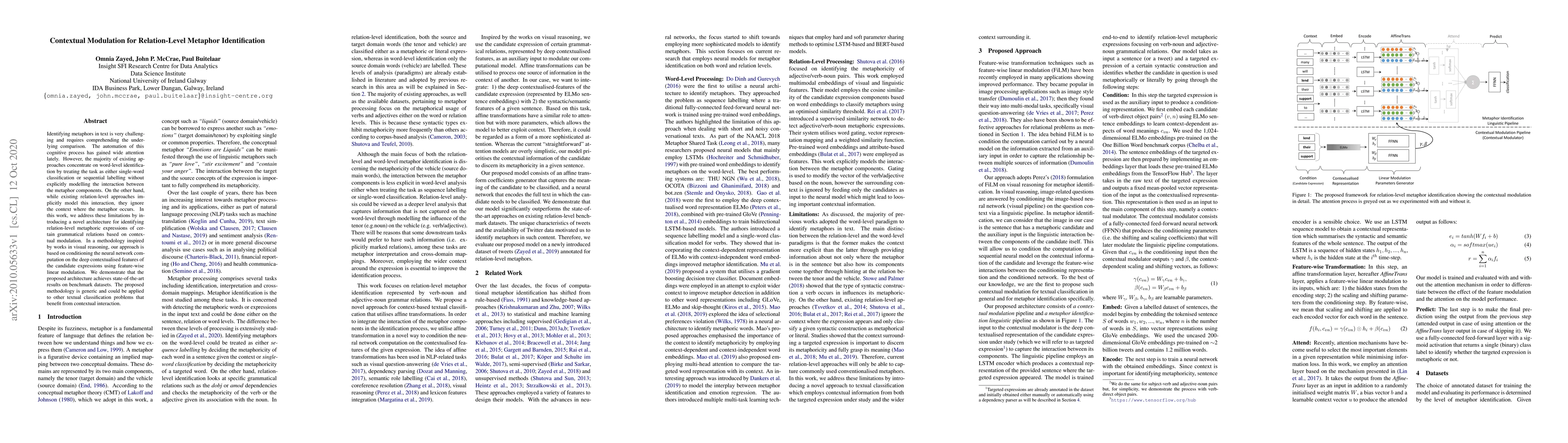 A new method for identifying metaphors in text is proposed, which uses contextual modulation to improve performance on relation-level metaphor identification tasks. The approach achieves state-of-the-art results on benchmark datasets.