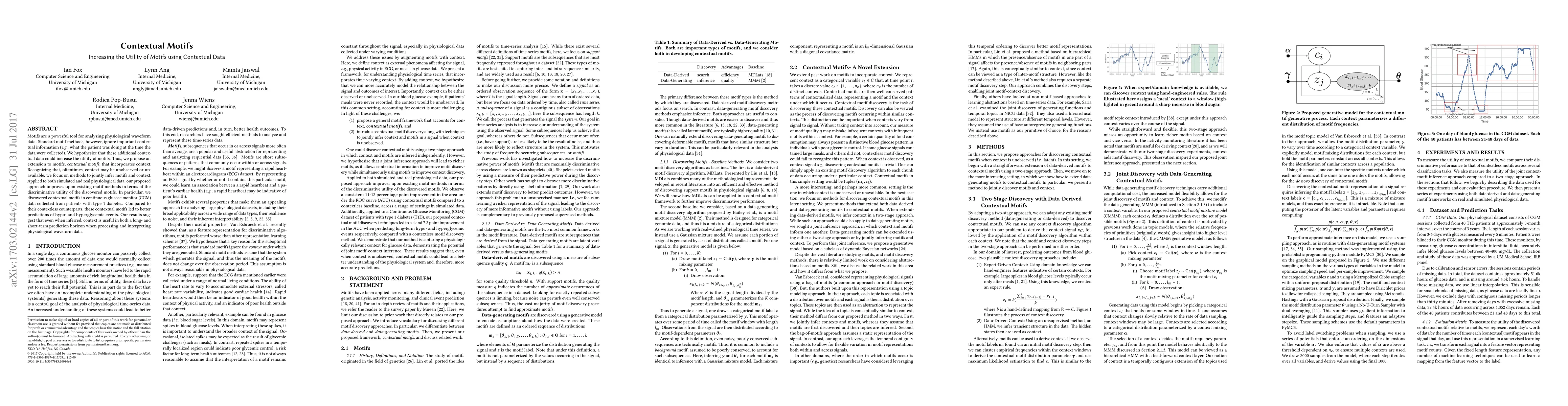 Motifs are a powerful tool for analyzing physiological waveform data. Standard motif methods, however, ignore important contextual information (e.g., what the patient was doing at the time the data were collected). We hypothesize that these additional contextual data could increase the utility of motifs. Thus, we propose an extension to motifs, contextual motifs, that incorporates context. Recognizing that, oftentimes, context may be unobserved or unavailable, we focus on methods to jointly infer motifs and context. Applied to both simulated and real physiological data, our proposed approach improves upon existing motif methods in terms of the discriminative utility of the discovered motifs. In particular, we discovered contextual motifs in continuous glucose monitor (CGM) data collected from patients with type 1 diabetes. Compared to their contextless counterparts, these contextual motifs led to better predictions of hypo- and hyperglycemic events. Our results suggest that even when inferred, context is useful in both a long- and short-term prediction horizon when processing and interpreting physiological waveform data.