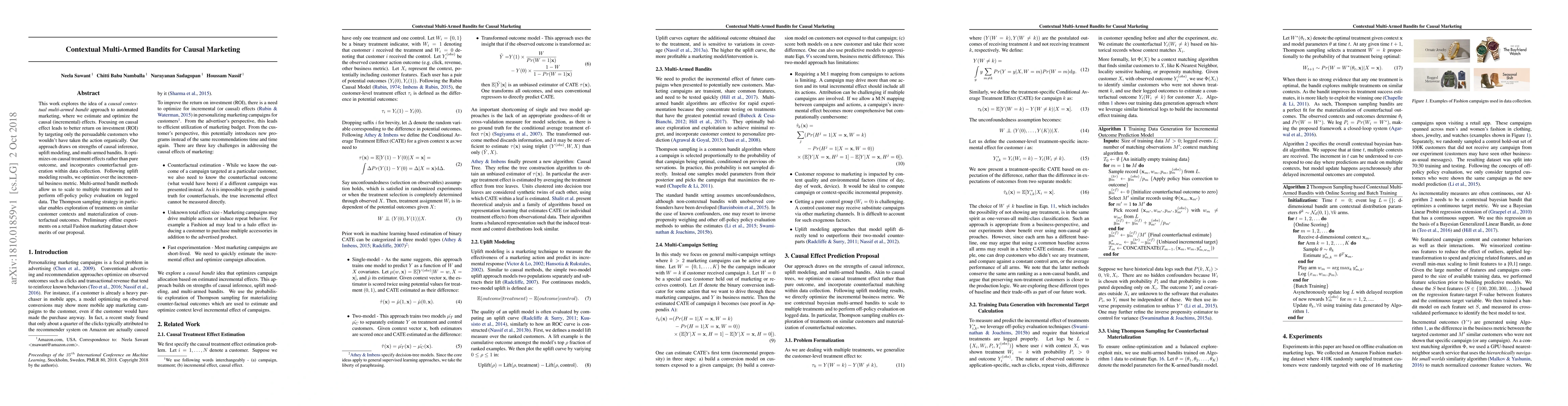This work explores the idea of a causal contextual multi-armed bandit approach to automated marketing, where we estimate and optimize the causal (incremental) effects. Focusing on causal effect leads to better return on investment (ROI) by targeting only the persuadable customers who wouldn't have taken the action organically. Our approach draws on strengths of causal inference, uplift modeling, and multi-armed bandits. It optimizes on causal treatment effects rather than pure outcome, and incorporates counterfactual generation within data collection. Following uplift modeling results, we optimize over the incremental business metric. Multi-armed bandit methods allow us to scale to multiple treatments and to perform off-policy policy evaluation on logged data. The Thompson sampling strategy in particular enables exploration of treatments on similar customer contexts and materialization of counterfactual outcomes. Preliminary offline experiments on a retail Fashion marketing dataset show merits of our proposal.