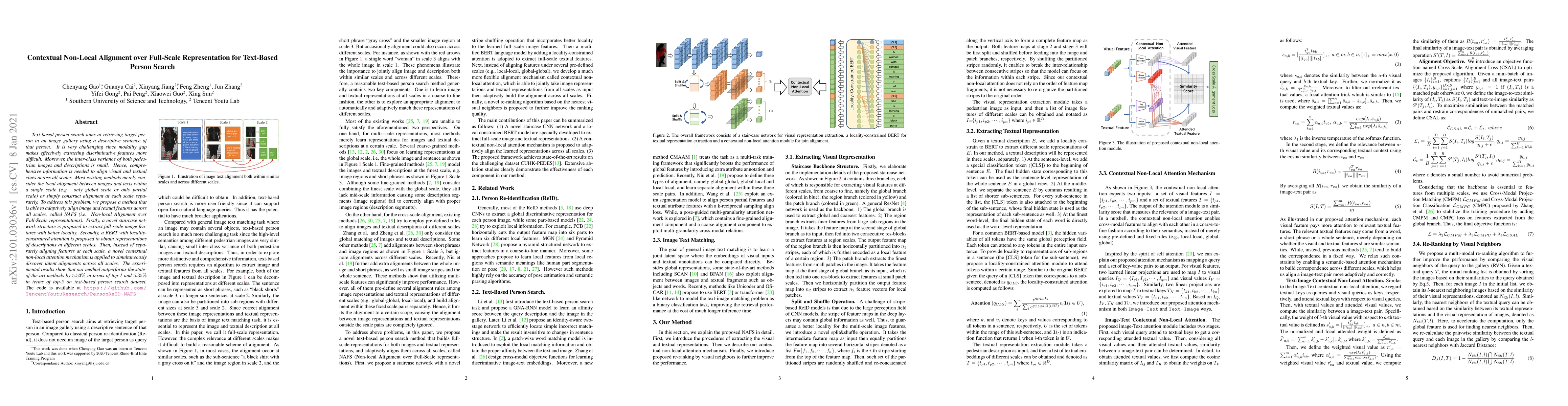 Text-based person search aims at retrieving target person in an image gallery using a descriptive sentence of that person. It is very challenging since modal gap makes effectively extracting discriminative features more difficult. Moreover, the inter-class variance of both pedestrian images and descriptions is small. So comprehensive information is needed to align visual and textual clues across all scales. Most existing methods merely consider the local alignment between images and texts within a single scale (e.g. only global scale or only partial scale) then simply construct alignment at each scale separately. To address this problem, we propose a method that is able to adaptively align image and textual features across all scales, called NAFS (i.e.Non-local Alignment over Full-Scale representations). Firstly, a novel staircase network structure is proposed to extract full-scale image features with better locality. Secondly, a BERT with locality-constrained attention is proposed to obtain representations of descriptions at different scales. Then, instead of separately aligning features at each scale, a novel contextual non-local attention mechanism is applied to simultaneously discover latent alignments across all scales. The experimental results show that our method outperforms the state-of-the-art methods by 5.53% in terms of top-1 and 5.35% in terms of top-5 on text-based person search dataset. The code is available at https://github.com/TencentYoutuResearch/PersonReID-NAFS