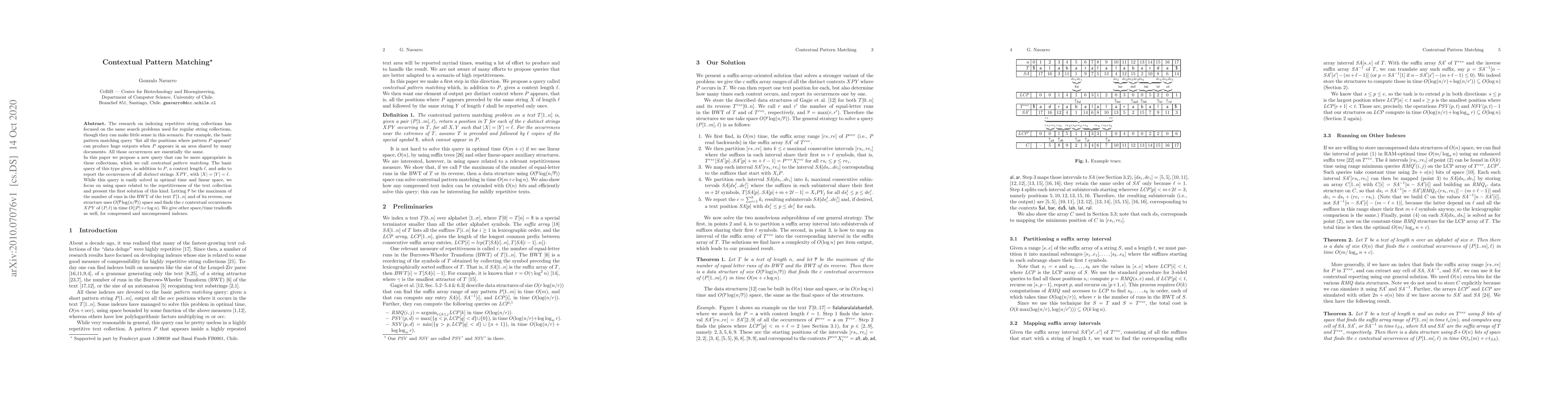 This paper introduces a new query type called contextual pattern matching for indexing repetitive string collections, which reports distinct substrings XPY given a pattern P and context length ℓ. The proposed solution optimizes space usage relative to the repetitiveness of the text, utilizing O(ovr log(n/ovr)) space and achieving O(|P| + c log n) time complexity for finding contextual occurrences.