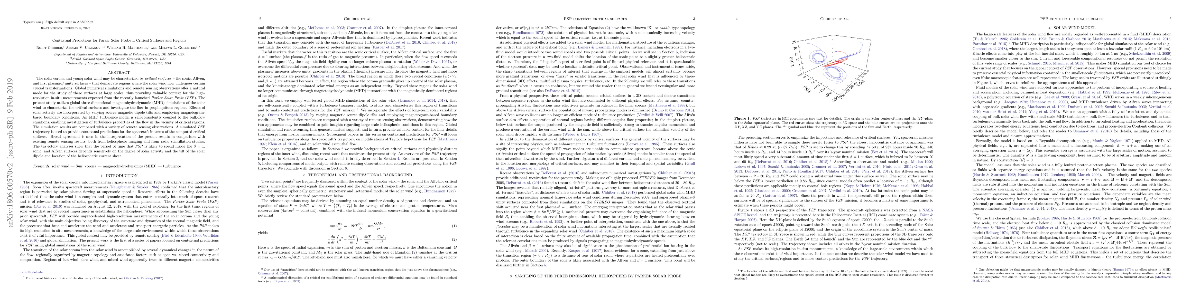 The solar corona and young solar wind may be characterized by critical surfaces -- the sonic, Alfv\'en, and first plasma-$\beta$ unity surfaces -- that demarcate regions where the solar wind flow undergoes certain crucial transformations. Global numerical simulations and remote sensing observations offer a natural mode for the study of these surfaces at large scales, thus providing valuable context for the high-resolution in-situ measurements expected from the soon-to-be-launched Parker Solar Probe (PSP). The present study utilizes global three-dimensional magnetohydrodynamic simulations of the solar wind to characterize the critical surfaces and investigate the flow in propinquitous regions. Effects of solar activity are incorporated by varying source magnetic dipole tilts and employing magnetogram-based boundary conditions. A magnetohydrodynamic turbulence model is self-consistently coupled to the bulk flow equations, enabling investigation of turbulence properties of the flow in the vicinity of critical regions. The simulation results are compared with a variety of remote sensing observations. A simulated PSP trajectory is used to provide contextual predictions for the spacecraft in terms of the computed critical surfaces. Broad agreement is seen in the interpretation of the present results in comparison with existing remote sensing results, both from heliospheric imaging and from radio scintillation studies. The trajectory analyses show that the period of time that PSP is likely to spend inside the $\beta=1$, sonic and Alfv\'en surfaces depends sensitively on the degree of solar activity and the tilt of the solar dipole and location of the heliospheric current sheet.