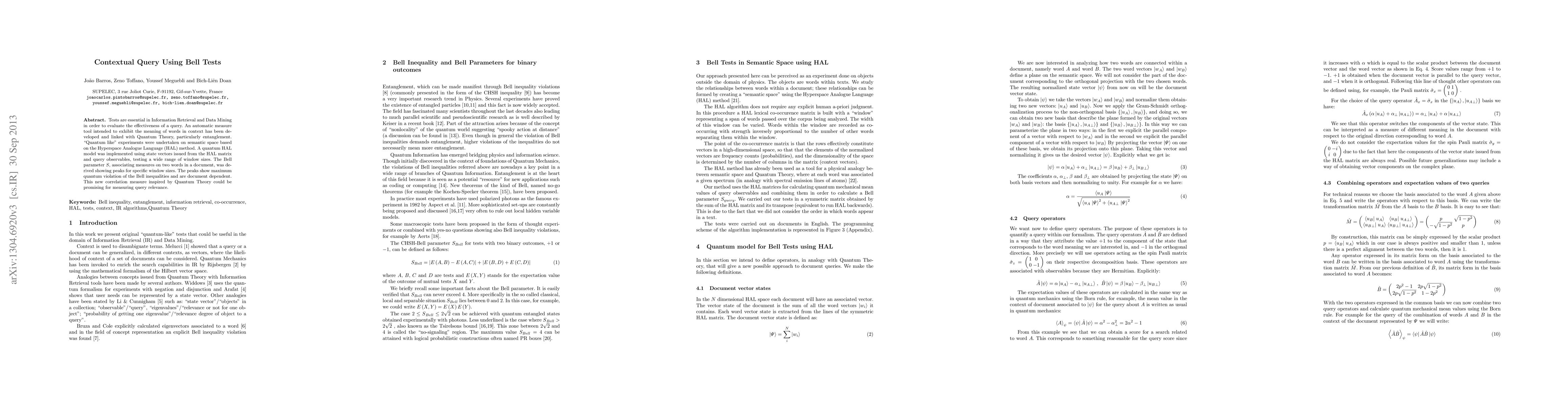 Tests are essential in Information Retrieval and Data Mining in order to evaluate the effectiveness of a query. An automatic measure tool intended to exhibit the meaning of words in context has been developed and linked with Quantum Theory, particularly entanglement. "Quantum like" experiments were undertaken on semantic space based on the Hyperspace Analogue Language (HAL) method. A quantum HAL model was implemented using state vectors issued from the HAL matrix and query observables, testing a wide range of windows sizes. The Bell parameter S, associating measures on two words in a document, was derived showing peaks for specific window sizes. The peaks show maximum quantum violation of the Bell inequalities and are document dependent. This new correlation measure inspired by Quantum Theory could be promising for measuring query relevance.