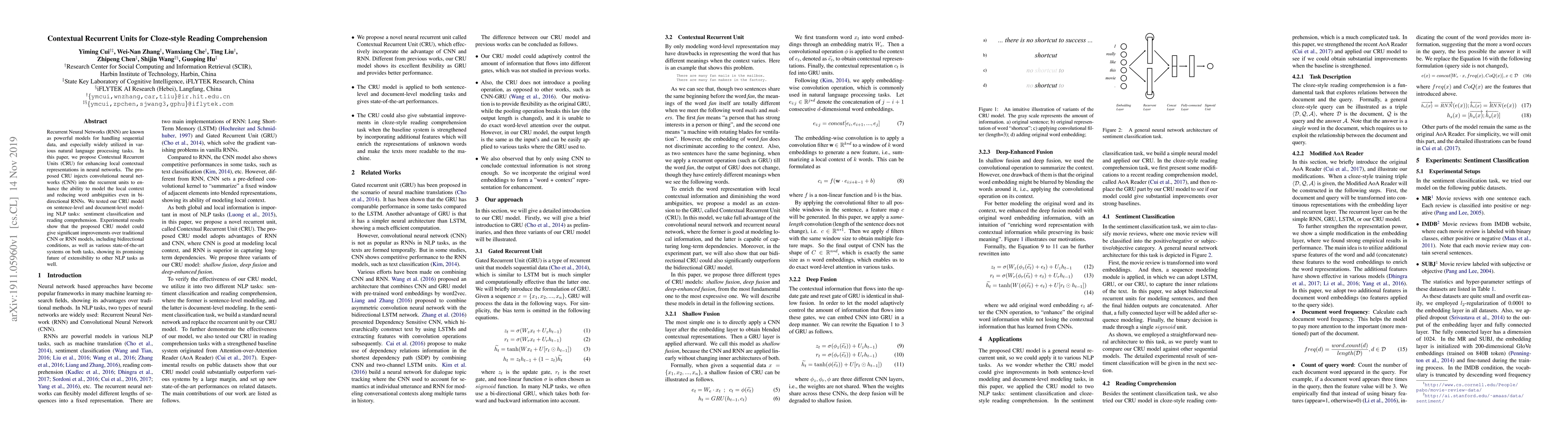 This research introduces Contextual Recurrent Units (CRU) to enhance local contextual representations in neural networks by integrating convolutional neural networks (CNN) into recurrent units. The proposed CRU model demonstrates significant improvements over traditional CNN and RNN models in sentiment classification and reading comprehension tasks, indicating its potential for broader applications in natural language processing.