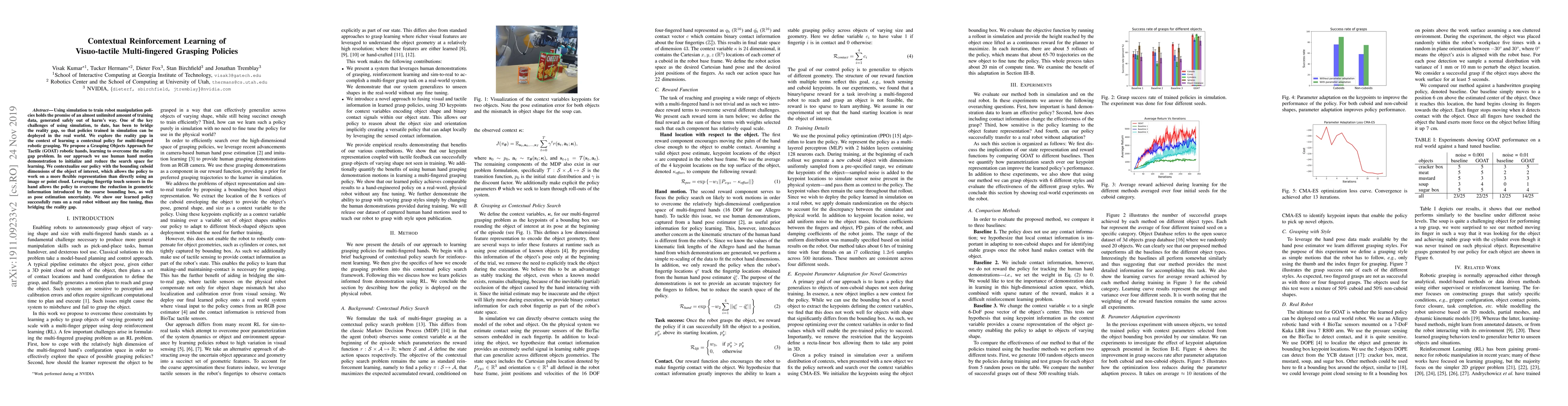 The research employs contextual reinforcement learning for training multi-fingered grasping policies using simulated environments. Human hand motion demonstrations are used to initialize and reduce the search space for learning. The policy is contextualized with the bounding cuboid dimensions of the object, leveraging fingertip touch sensors to overcome geometric information loss and pose estimation uncertainty.