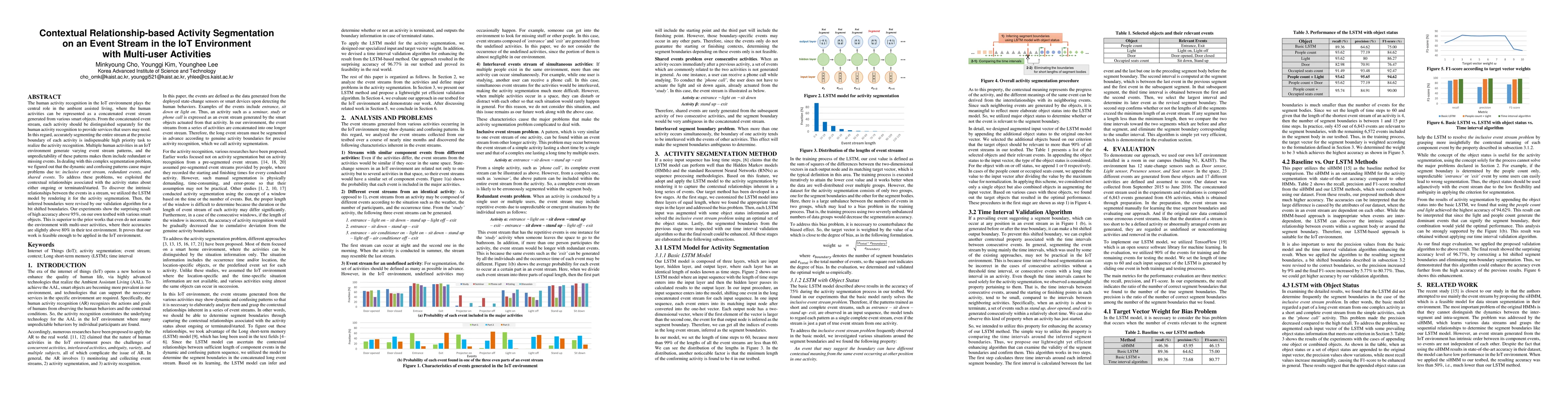The human activity recognition in the IoT environment plays the central role in the ambient assisted living, where the human activities can be represented as a concatenated event stream generated from various smart objects. From the concatenated event stream, each activity should be distinguished separately for the human activity recognition to provide services that users may need. In this regard, accurately segmenting the entire stream at the precise boundary of each activity is indispensable high priority task to realize the activity recognition. Multiple human activities in an IoT environment generate varying event stream patterns, and the unpredictability of these patterns makes them include redundant or missing events. In dealing with this complex segmentation problem, we figured out that the dynamic and confusing patterns cause major problems due to: inclusive event stream, redundant events, and shared events. To address these problems, we exploited the contextual relationships associated with the activity status about either ongoing or terminated/started. To discover the intrinsic relationships between the events in a stream, we utilized the LSTM model by rendering it for the activity segmentation. Then, the inferred boundaries were revised by our validation algorithm for a bit shifted boundaries. Our experiments show the surprising result of high accuracy above 95%, on our own testbed with various smart objects. This is superior to the prior works that even do not assume the environment with multi-user activities, where their accuracies are slightly above 80% in their test environment. It proves that our work is feasible enough to be applied in the IoT environment.