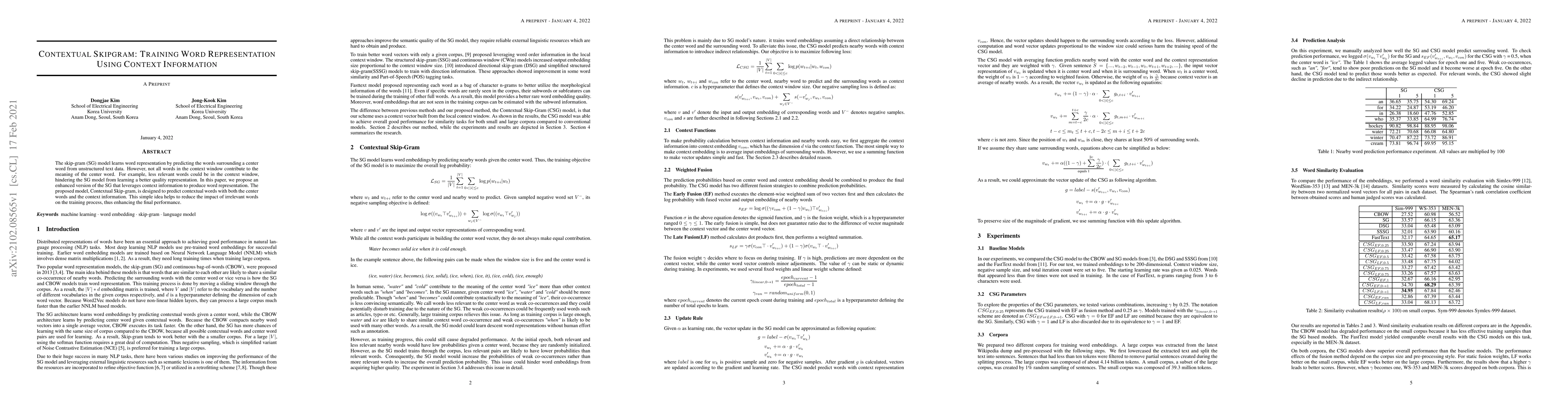 Title: Contextual Skipgram: Training Word Representation Using Context Information Summary: This paper introduces a Contextual Skip-gram model that improves word representation by incorporating context information to filter out irrelevant words, thereby enhancing the predictive accuracy of surrounding words for the center word.