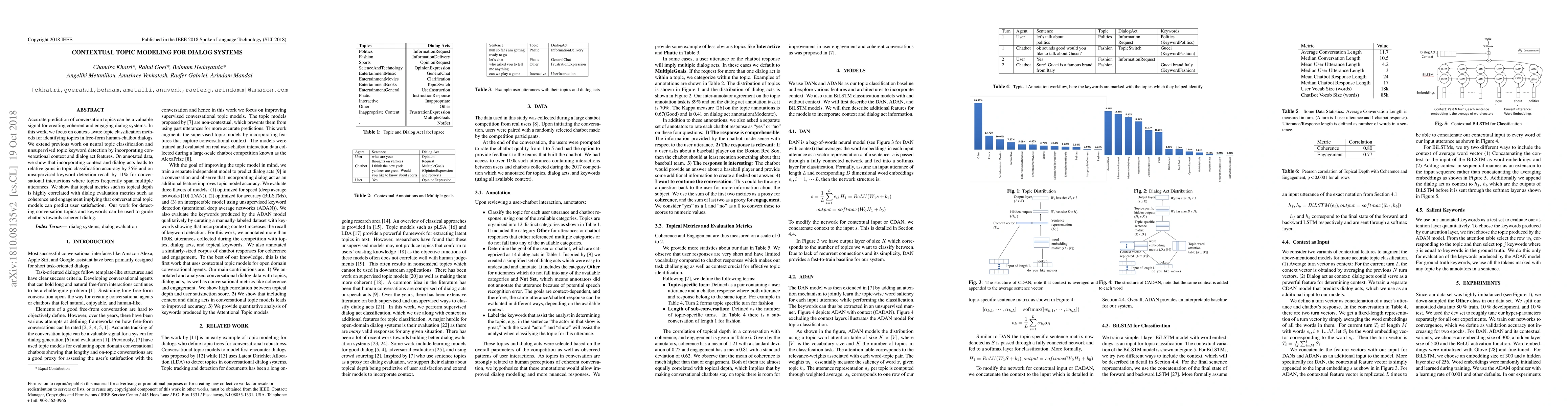 Accurate prediction of conversation topics can be a valuable signal for creating coherent and engaging dialog systems. In this work, we focus on context-aware topic classification methods for identifying topics in free-form human-chatbot dialogs. We extend previous work on neural topic classification and unsupervised topic keyword detection by incorporating conversational context and dialog act features. On annotated data, we show that incorporating context and dialog acts leads to relative gains in topic classification accuracy by 35% and on unsupervised keyword detection recall by 11% for conversational interactions where topics frequently span multiple utterances. We show that topical metrics such as topical depth is highly correlated with dialog evaluation metrics such as coherence and engagement implying that conversational topic models can predict user satisfaction. Our work for detecting conversation topics and keywords can be used to guide chatbots towards coherent dialog.