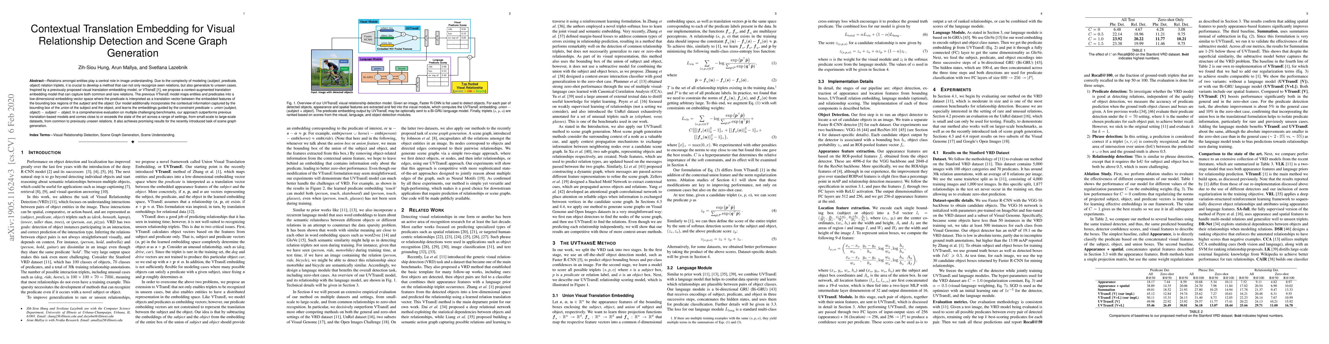 Relations amongst entities play a central role in image understanding. Due to the complexity of modeling (subject, predicate, object) relation triplets, it is crucial to develop a method that can not only recognize seen relations, but also generalize to unseen cases. Inspired by a previously proposed visual translation embedding model, or VTransE, we propose a context-augmented translation embedding model that can capture both common and rare relations. The previous VTransE model maps entities and predicates into a low-dimensional embedding vector space where the predicate is interpreted as a translation vector between the embedded features of the bounding box regions of the subject and the object. Our model additionally incorporates the contextual information captured by the bounding box of the union of the subject and the object, and learns the embeddings guided by the constraint predicate $\approx$ union (subject, object) $-$ subject $-$ object. In a comprehensive evaluation on multiple challenging benchmarks, our approach outperforms previous translation-based models and comes close to or exceeds the state of the art across a range of settings, from small-scale to large-scale datasets, from common to previously unseen relations. It also achieves promising results for the recently introduced task of scene graph generation.