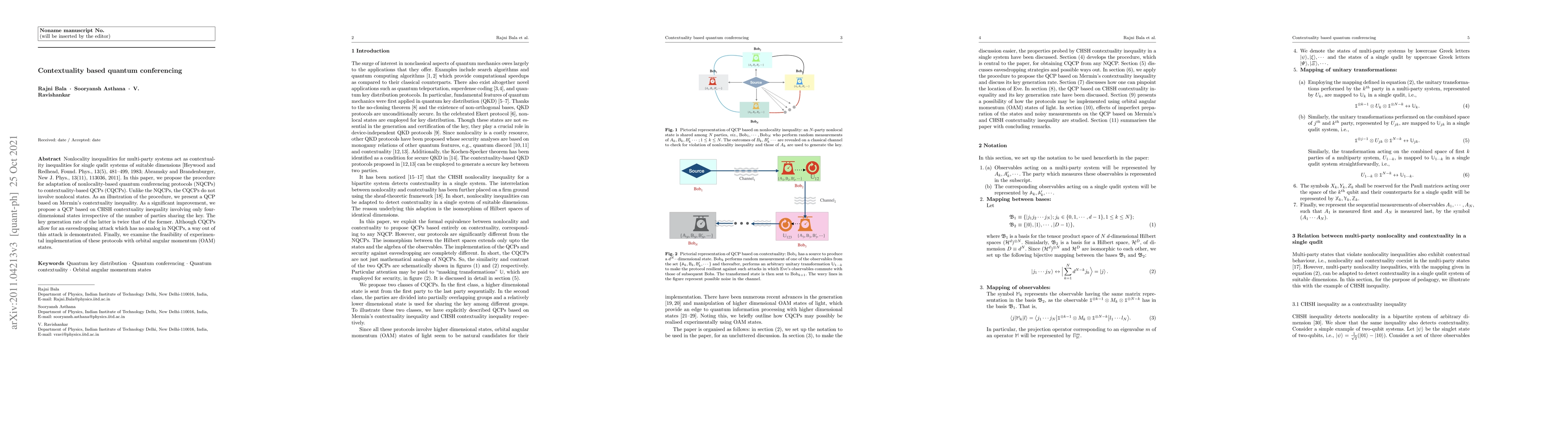 Nonlocality inequalities for multi-party systems act as contextuality inequalities for single qudit systems of suitable dimensions. In this paper, we propose the procedure for adaptation of nonlocality-based quantum conferencing protocols (QCPs) to contextuality-based QCPs. Unlike the nonlocality-based protocols, the proposed protocols do not involve nonlocal states. These protocols can also be implemented in a class of noisy channels without any compromise in the key generation rate. As an illustration of the procedure, we present a QCP based on Mermin's contextuality inequality. As a significant improvement, we propose a QCP based on CHSH contextuality inequality involving only four-dimensional states irrespective of the number of parties sharing the key. The key generation rate of the latter is twice that of the former. Although these QCPs allow for an eavesdropping attack which has no analog in nonlocality-based QCPs, a way out of this attack is demonstrated. Finally, we show the feasibility of experimental implementation of these protocols with orbital angular momentum (OAM) states.