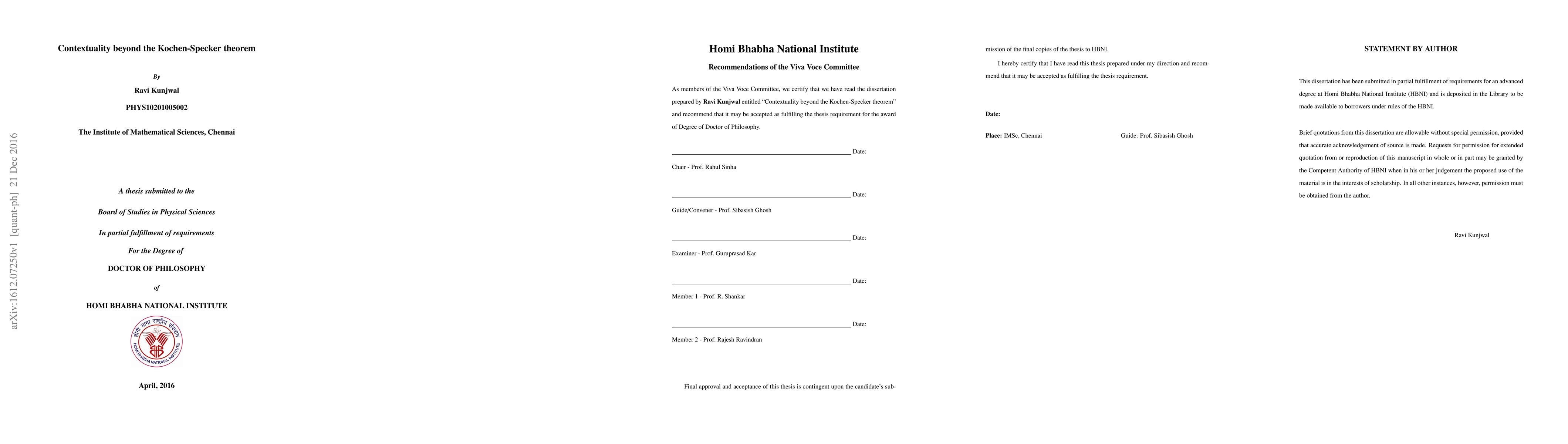 When it isn't possible to tell two distinct experimental procedures apart purely from their input/output statistics, then it seems a plausible hypothesis that the two procedures must be physically identical. We call such a hypothesis "noncontextuality", an instance of Leibniz's principle of the identity of indiscernibles. Read in the contrapositive, this hypothesis entails that any physical distinctions between two experimental procedures must necessarily lead to a difference in their operational statistics. The results I present in this thesis concern the failure of this hypothesis -- a failure dubbed "contextuality" -- when one tries to embed an operational theory (such as quantum theory) in the ontological models framework. The Kochen-Specker theorem demonstrates the failure of noncontextuality for deterministic ontological models of quantum theory, i.e., those ontological models where the ontic/physical state of the system fixes the outcome of any projective measurement on the system in a deterministic manner. This thesis goes beyond the Kochen-Specker (KS) theorem by asking what operational facts must be verified in experiments to conclude that Nature does not admit noncontextual ontological models, not even indeterministic ones. This leads to noncontextuality inequalities that are robust to noise in the preparations and measurements. In the particular case of quantum theory, these inequalities are meaningful even when unsharp measurements (or POVMs) are allowed, a feature not shared by the traditional approach to KS-noncontextuality where unsharp measurements are excluded by fiat: allowing them renders even trivial POVMs (proportional to identity) maximally KS-contextual. The sense in which trivial POVMs are indeed "trivial" (or "noncontextual") is clear in our approach: they are simply too noisy to lead to violation of our noncontextuality inequalities.