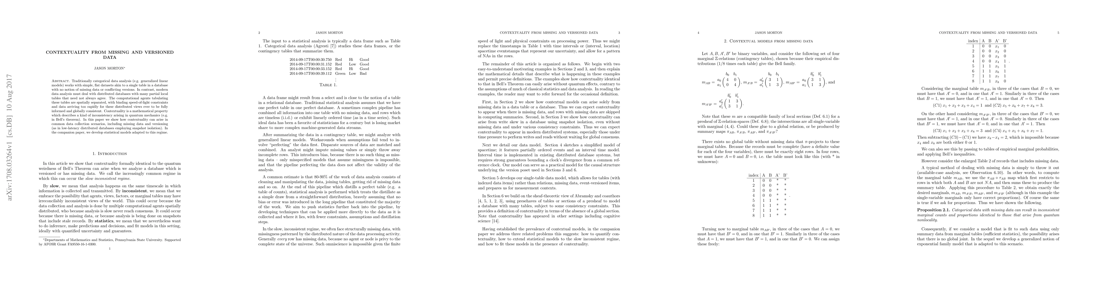 Traditionally categorical data analysis (e.g. generalized linear models) works with simple, flat datasets akin to a single table in a database with no notion of missing data or conflicting versions. In contrast, modern data analysis must deal with distributed databases with many partial local tables that need not always agree. The computational agents tabulating these tables are spatially separated, with binding speed-of-light constraints and data arriving too rapidly for these distributed views ever to be fully informed and globally consistent. Contextuality is a mathematical property which describes a kind of inconsistency arising in quantum mechanics (e.g. in Bell's theorem). In this paper we show how contextuality can arise in common data collection scenarios, including missing data and versioning (as in low-latency distributed databases employing snapshot isolation). In the companion paper, we develop statistical models adapted to this regime.