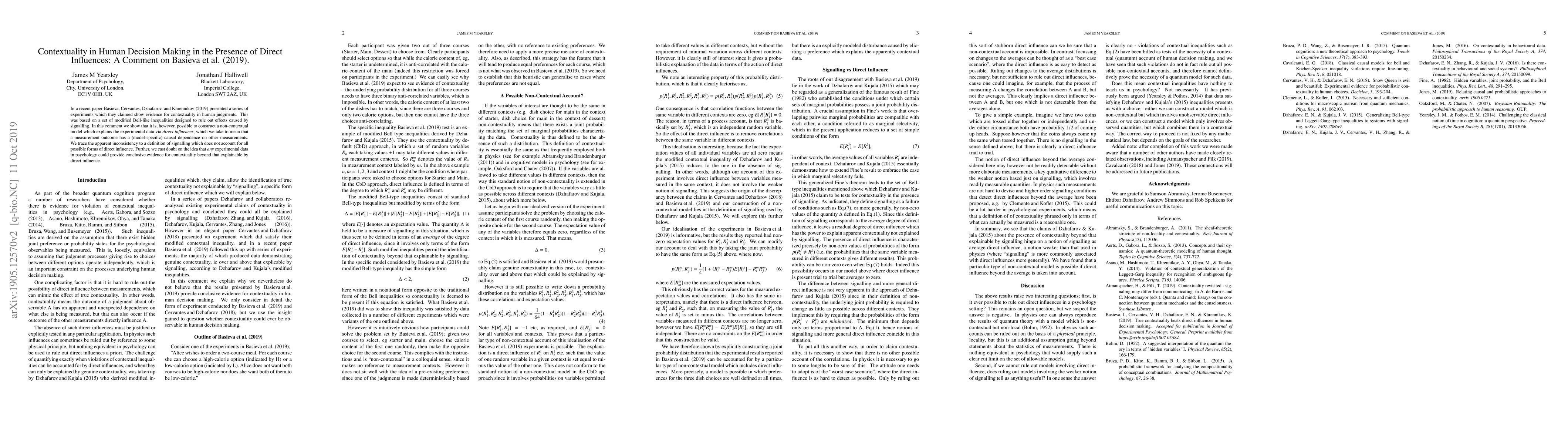 In a recent paper Basieva, Cervantes, Dzhafarov, and Khrennikov (2019) presented a series of experiments which they claimed show evidence for contextuality in human judgments. This was based on a set of modified Bell-like inequalities designed to rule out effects caused by signalling. In this comment we show that it is, however, possible to construct a non-contextual model which explains the experimental data via direct influences, which we take to mean that a measurement outcome has a (model-specific) causal dependence on other measurements. We trace the apparent inconsistency to a definition of signalling which does not account for all possible forms of direct influence. Further, we cast doubt on the idea that any experimental data in psychology could provide conclusive evidence for contextuality beyond that explainable by direct influence.