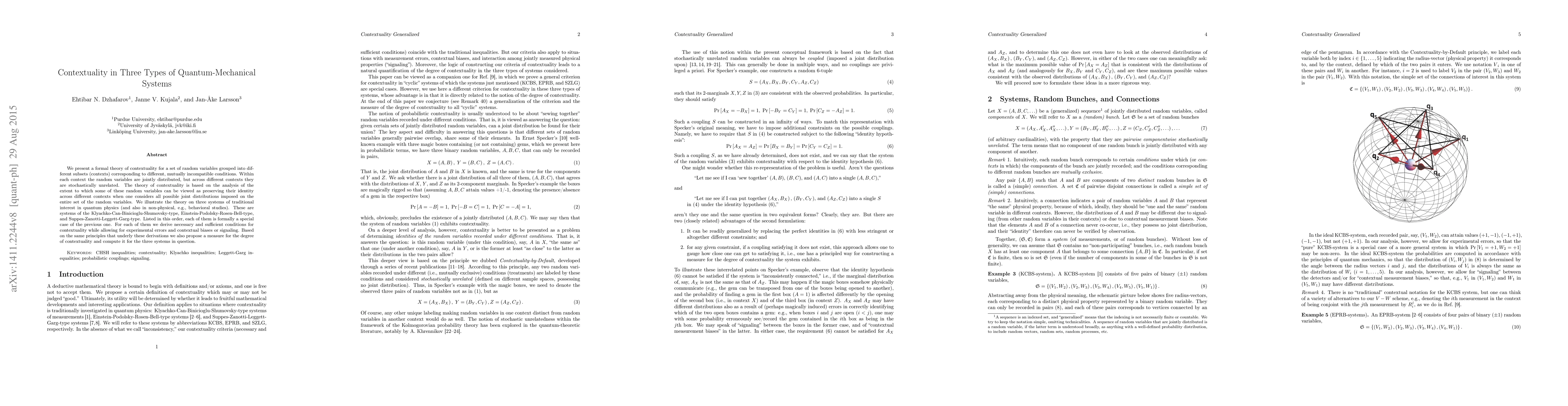 This paper develops a formal theory of contextuality for random variables grouped into contexts, analyzing how variables maintain identity across different conditions. It derives necessary and sufficient conditions for contextuality in three quantum systems and proposes a measure for contextuality degree, applied to these systems.