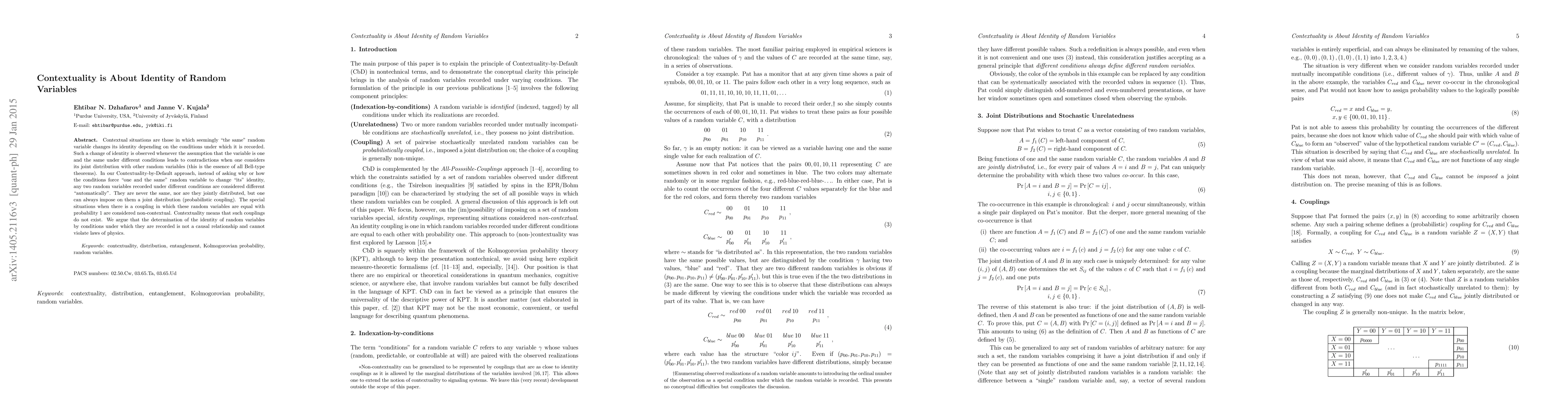 Contextual situations are those in which seemingly "the same" random variable changes its identity depending on the conditions under which it is recorded. Such a change of identity is observed whenever the assumption that the variable is one and the same under different conditions leads to contradictions when one considers its joint distribution with other random variables (this is the essence of all Bell-type theorems). In our Contextuality-by-Default approach, instead of asking why or how the conditions force "one and the same" random variable to change "its" identity, any two random variables recorded under different conditions are considered different "automatically". They are never the same, nor are they jointly distributed, but one can always impose on them a joint distribution (probabilistic coupling). The special situations when there is a coupling in which these random variables are equal with probability 1 are considered non-contextual. Contextuality means that such couplings do not exist. We argue that the determination of the identity of random variables by conditions under which they are recorded is not a causal relationship and cannot violate laws of physics.