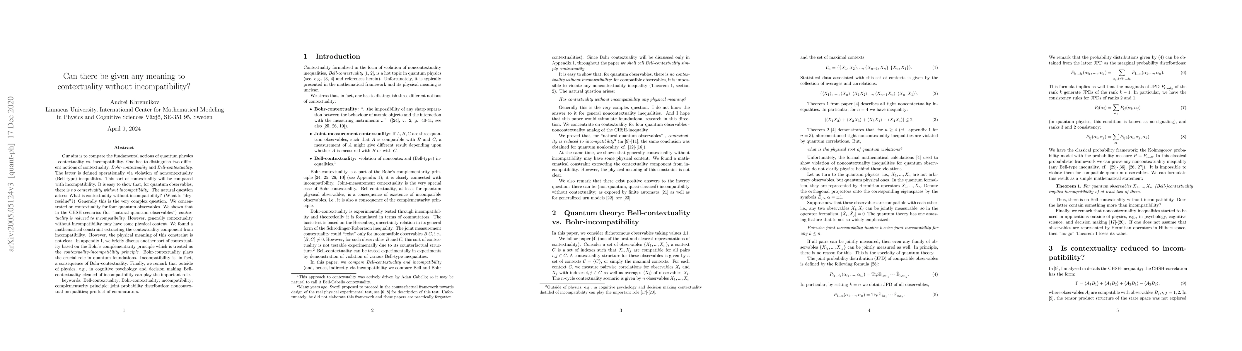 This paper compares quantum physics' notions of contextuality and incompatibility, distinguishing between Bohr-contextuality and Bell-contextuality. It finds that quantum observables exhibit no contextuality without incompatibility, but contextuality without incompatibility may still hold physical significance. The study reveals a mathematical constraint isolating contextuality from incompatibility, though its physical meaning remains unclear.
