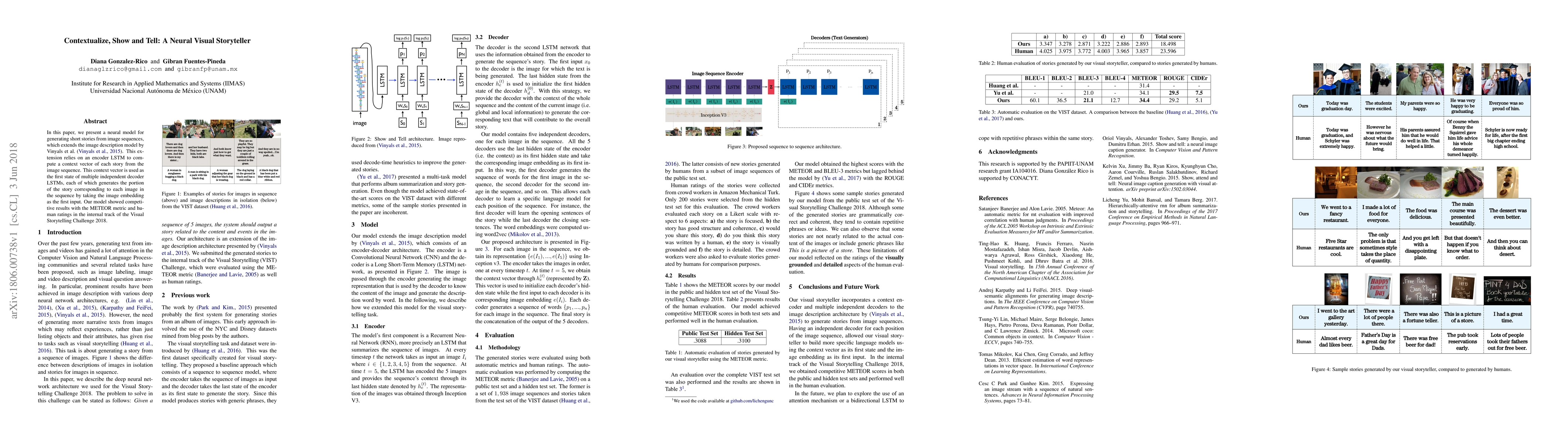 This paper introduces a neural model that generates short stories from image sequences, improving upon Vinyals et al.'s image description model. It uses an encoder LSTM to create a context vector from the image sequence, which initializes multiple decoder LSTMs. Each decoder LSTM then produces story portions corresponding to each image, using the image embedding as input. The model achieved competitive results in the Visual Storytelling Challenge 2018.