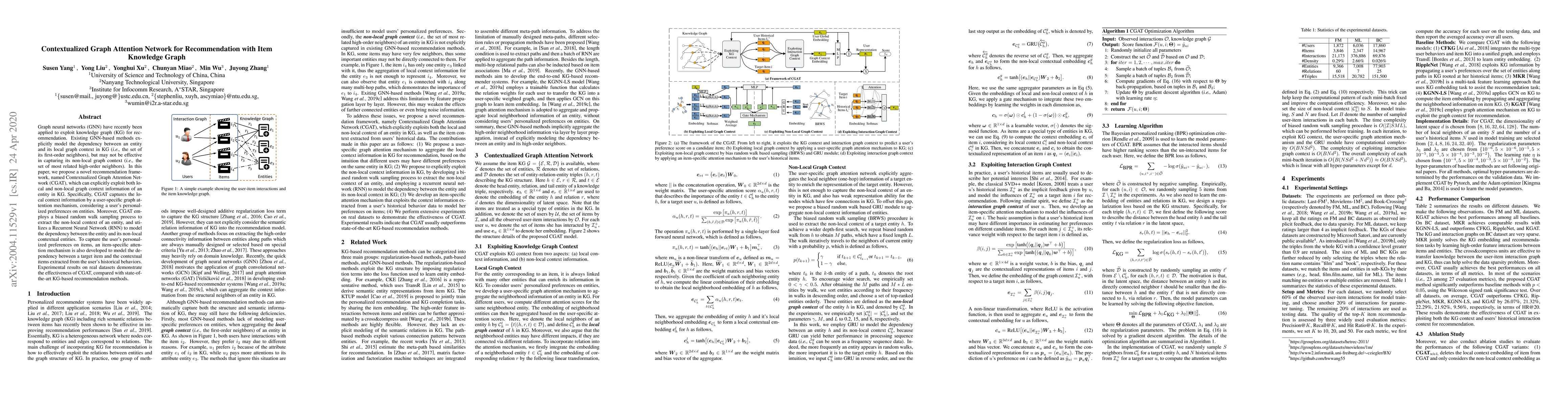 This paper introduces a Contextualized Graph Attention Network (CGAT) for recommendation that leverages both local and non-local context from an item knowledge graph. It uses a user-specific attention mechanism for local context and an RNN for non-local context, along with an item-specific attention mechanism to model user preferences, demonstrating improved performance over existing methods.