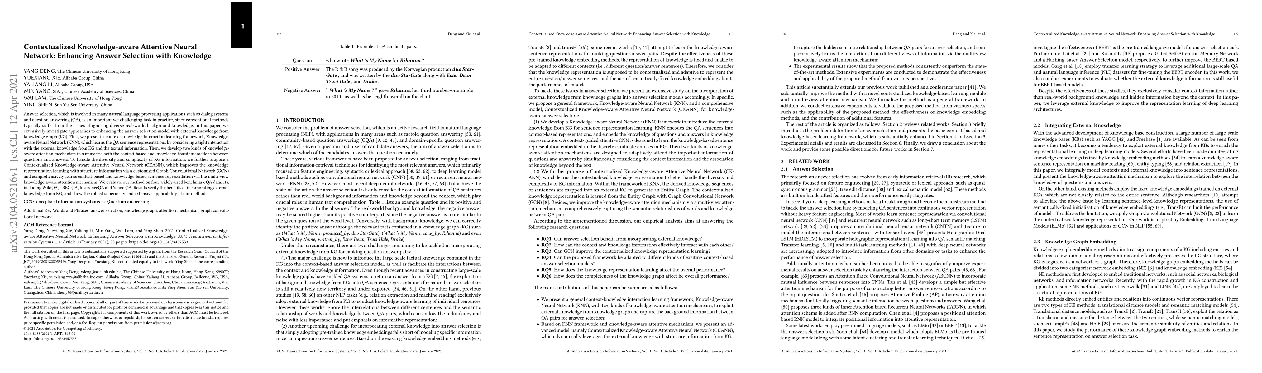 This paper proposes a Contextualized Knowledge-aware Attentive Neural Network (CKANN) to enhance answer selection in natural language processing tasks by integrating knowledge from a knowledge graph. The CKANN framework uses a Graph Convolutional Network and a multi-view attention mechanism to effectively combine context and knowledge-based interactions, demonstrating superior performance on multiple QA datasets.