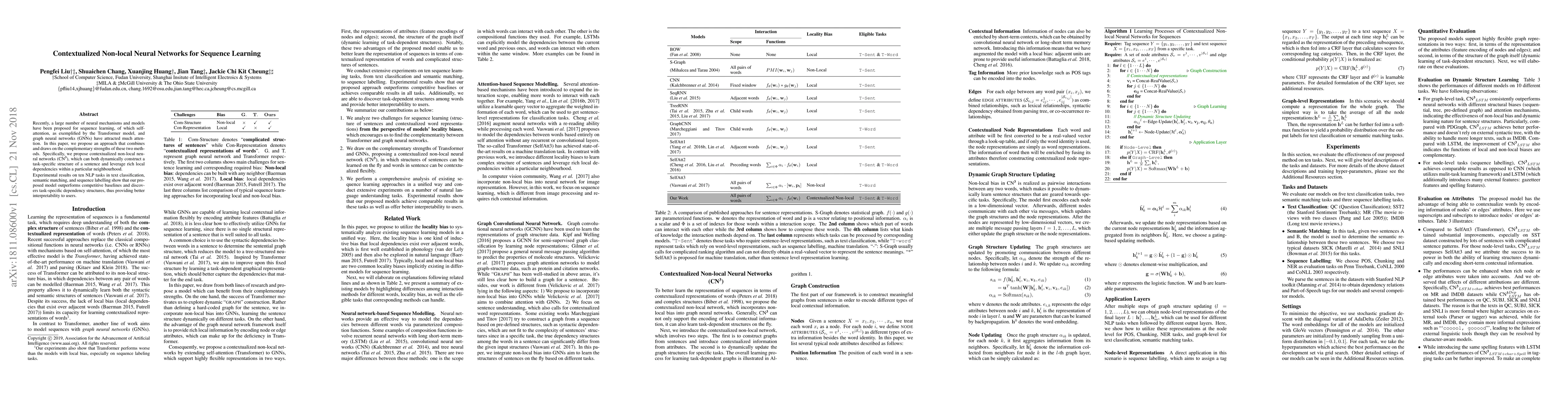 Recently, a large number of neural mechanisms and models have been proposed for sequence learning, of which self-attention, as exemplified by the Transformer model, and graph neural networks (GNNs) have attracted much attention. In this paper, we propose an approach that combines and draws on the complementary strengths of these two methods. Specifically, we propose contextualized non-local neural networks (CN$^{\textbf{3}}$), which can both dynamically construct a task-specific structure of a sentence and leverage rich local dependencies within a particular neighborhood. Experimental results on ten NLP tasks in text classification, semantic matching, and sequence labeling show that our proposed model outperforms competitive baselines and discovers task-specific dependency structures, thus providing better interpretability to users.